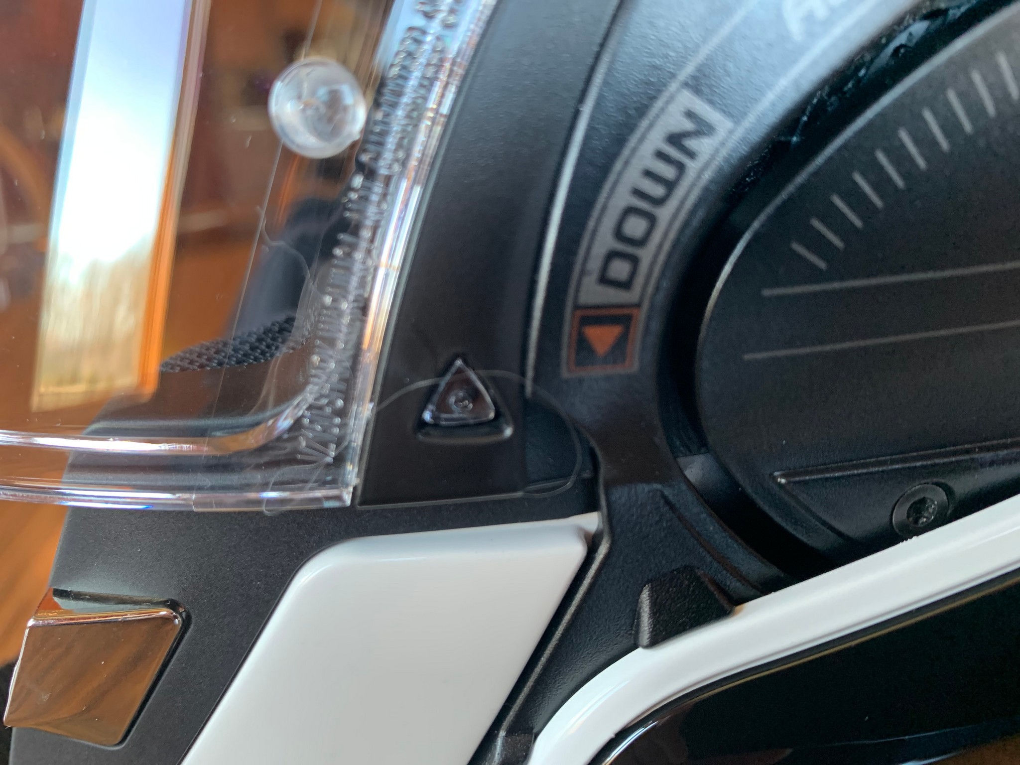 Inside the chin bar is a slide vent. This appears to be a de-mister since the air tunnels point straight up to the inside of the face shield. I can feel the cool air on my face when it is open. Riding on a cool morning I closed it and the bottom of the face shield immediately started to fog (I had not yet put in the Pinlock insert). As soon as I opened it the visor cleared right up. This is a neat little trick that does away with the need to crack the visor open to de-mist.