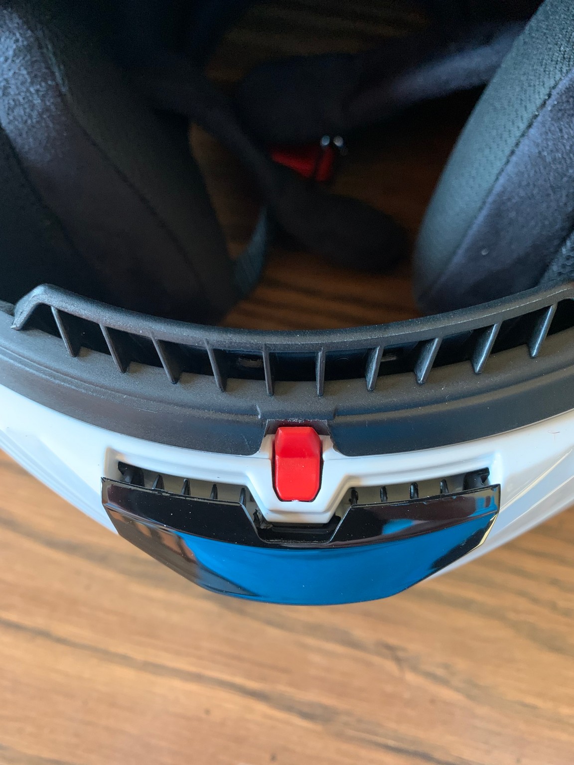 The chin vent is a little different. It appears to be more of an exhaust vent than an intake since the air channels are on top of the rocker vent. I couldn’t feel any airflow when it was open and couldn’t really see that any air channels lead from the vent into the helmet. It does work well in conjunction with the sliding vent however as a de-mister. With both of them open there was no fogging of the face shield while I was moving even without the Pinlock insert.