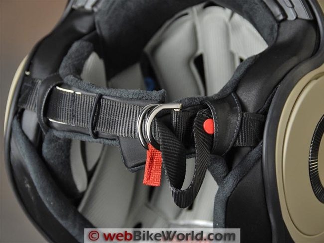 The Shark Raw chin strap uses a double-D ring attachment system with a plastic snap to hold the excess. The snap is nicely hidden under a fabric strap. The padding under the chin strap is adequate and comfortable.