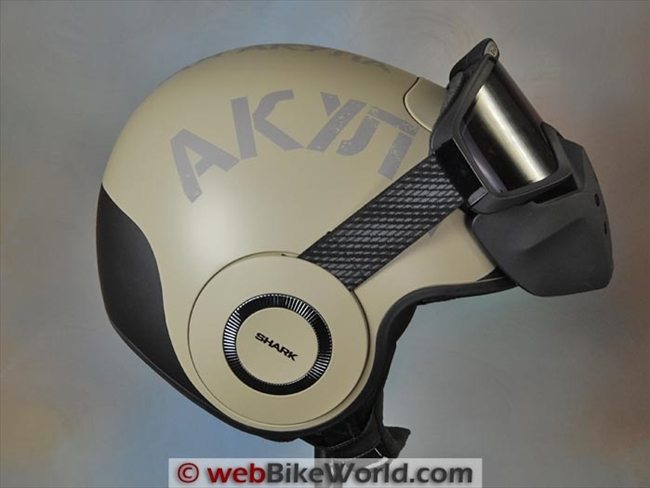The strap for the goggles rotates up and down in a clever design hidden under the side plates. Once the helmet is on, it’s easy to pull the goggles and face mask assembly forward and then up and on to the top of the helmet for that “ton up” look (although the face mask acts as an air catch if you leave it that way and start riding).