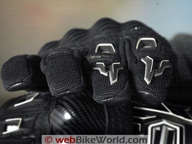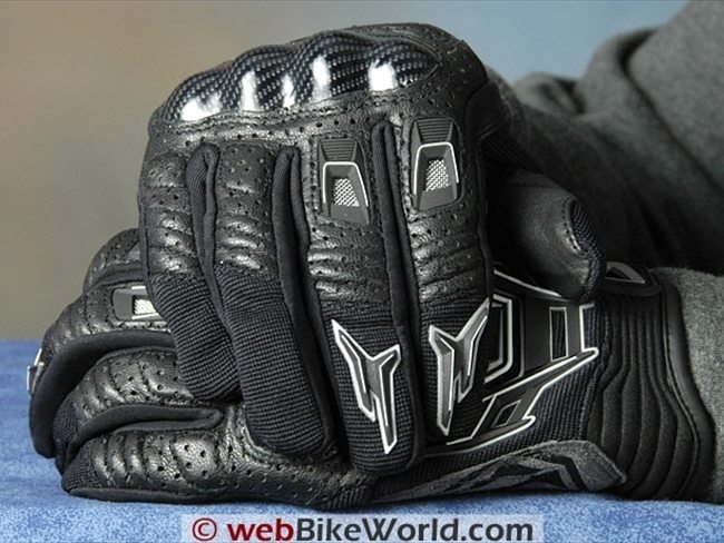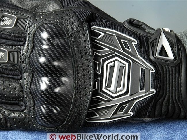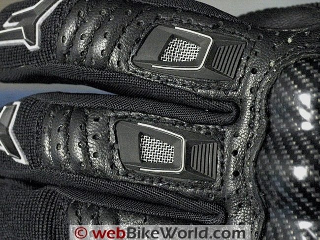 Other than the big carbon fiber main knuckle protector on top and the thin leather palms with a couple of reinforcement patches on the heel and at the grip point, pretty much the rest of the gloves are made from some type of thin stretchy fabric.