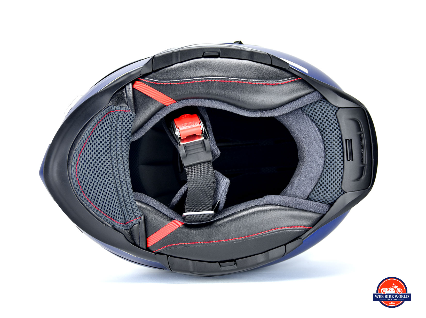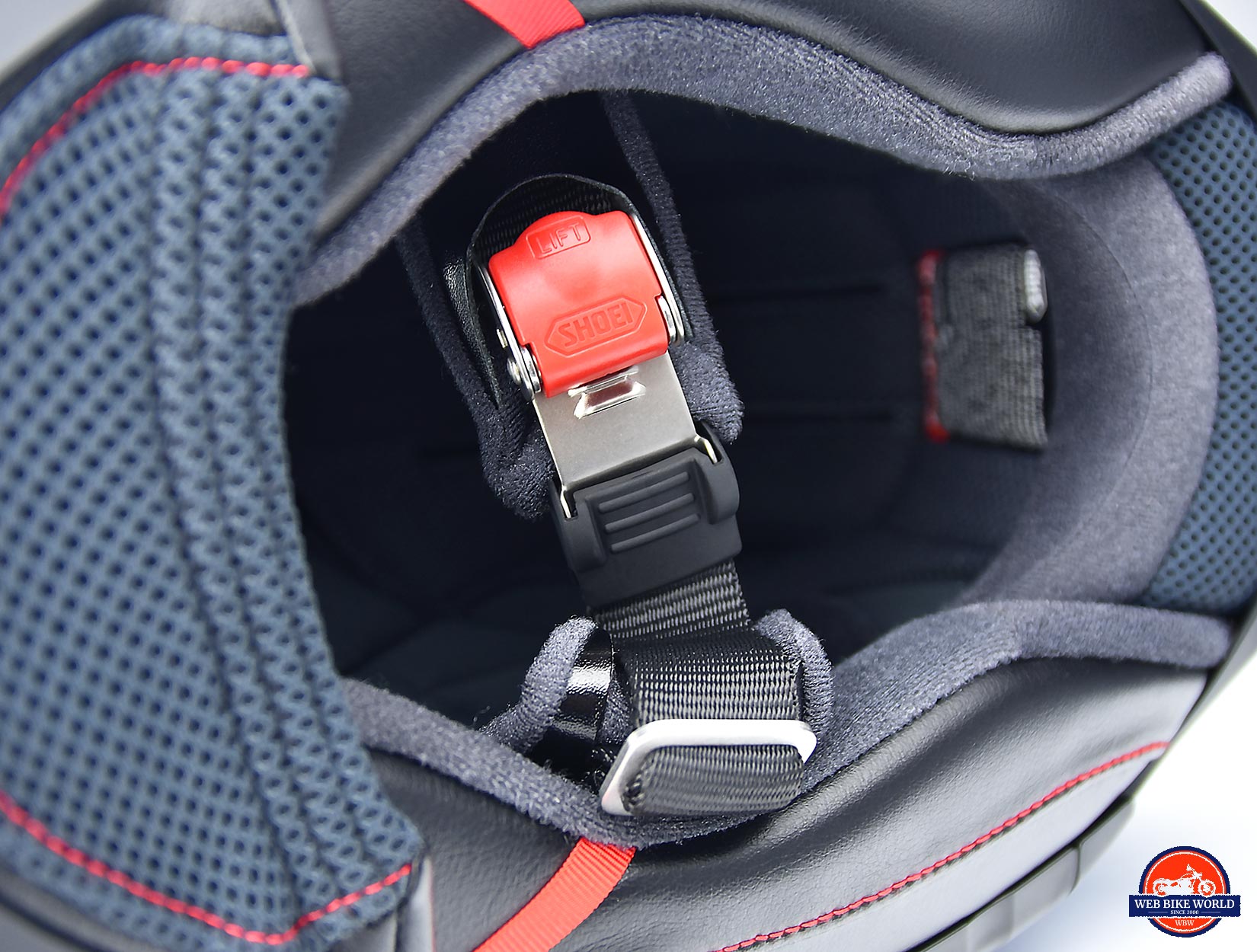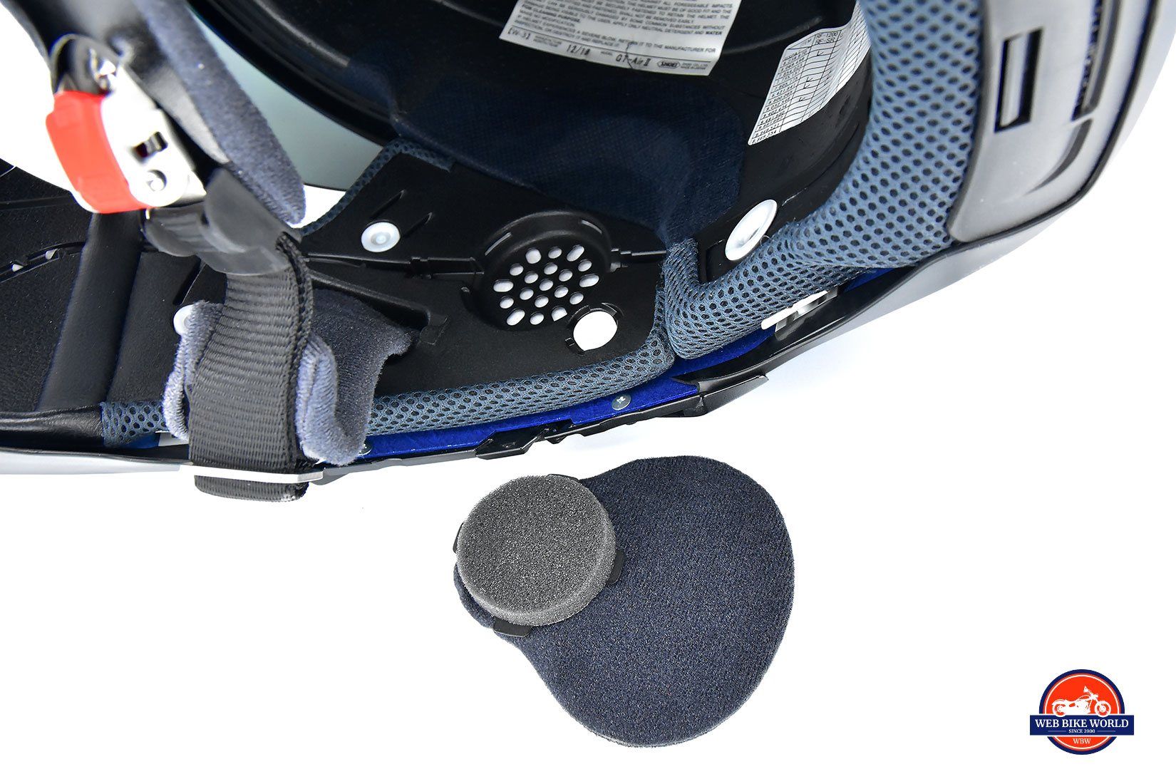 On the bottom of the cheek pads on the leather area, you’ll find two red strips of nylon which are there to be pulled on in the event of an emergency to remove all the cheek padding and foam at once. A nice feature should a disaster occur and your helmet needs to be removed quickly to give medical aid.