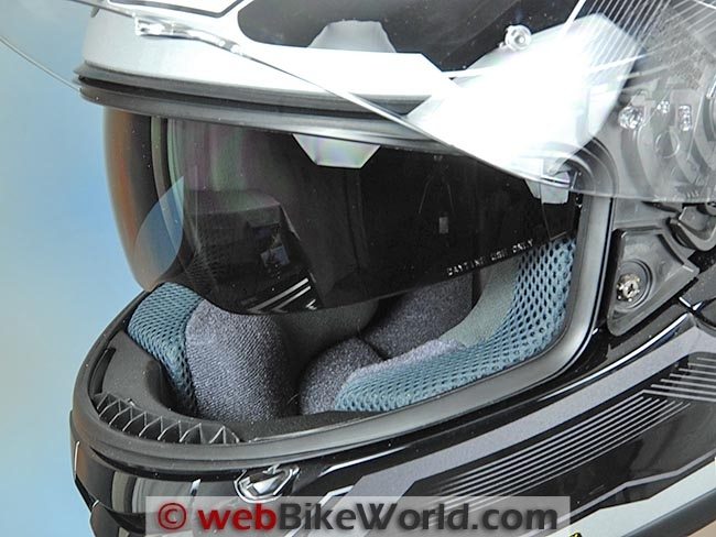 The design of the interior and shape of the shell inner dimensions are the same as the other Shoei full-face helmets, according to Shoei.]