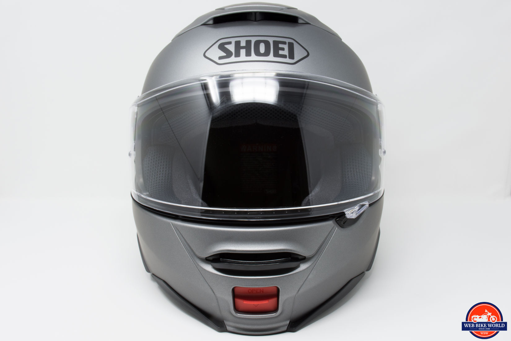 What do I like? Well, it’s a Shoei so the fit and finish is superb. The mechanism is a super clean design (but do we really need a big red thing on the front? Come on, man). I like how far the check pads wrap around my face when the face is up. Airflow is fine, comfort is good. Noise is what it is. No weird suction or wobble issues.