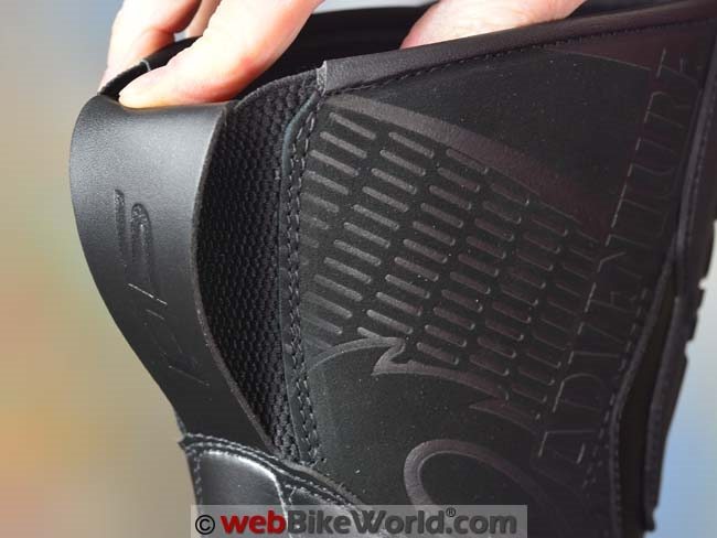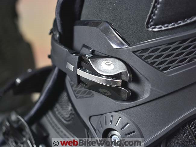 On the Adventure 2 boots, this piece along with the integrated upper cam buckle strap provides a strong supportive wrap-around and, pivoting joint for great on-peg flexibility or for when climbing over rugged terrain (been there, done that). Contributing to both closure and protection are the two micro-adjustable strap and buckle assemblies. One is located over the instep and the other above the ankle point (which is integrated with the Flex System) — become an integral part of the overall protection layering. When in use, the buckles have a low profile that is almost equal to the pivot point molding and another raised ridge molding on the lower plastic side plate.
