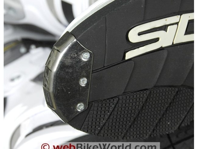 De rigueur for most off-road boots, a polished metal toe plate is riveted and screwed to the front edge of the sole, adding additional frontal protection and, the ability to create sparks — so impressive at speed!