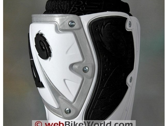 This lining is actually comprised of two large flexible wrap-around multi-piece assemblies or plates held together with light screws. The plates form their protective outer sheath when secured by the Sidi cam-lock buckles and straps.