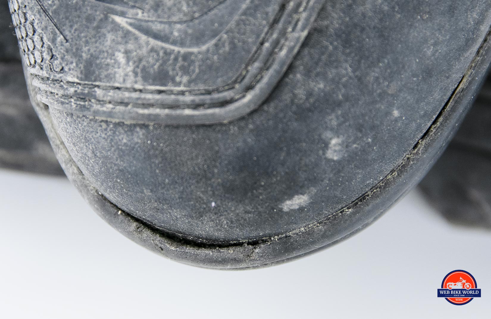 This happened to me twice during the course of the testing time I spent in California. Consequently, those nosedives into the asphalt forced back and slightly separated the top edge of the rubber sole for about ¾ of an inch on the left boot toe (photo above). I’m happy that it held up to these two scrubs and the damage is minimal to the boots.