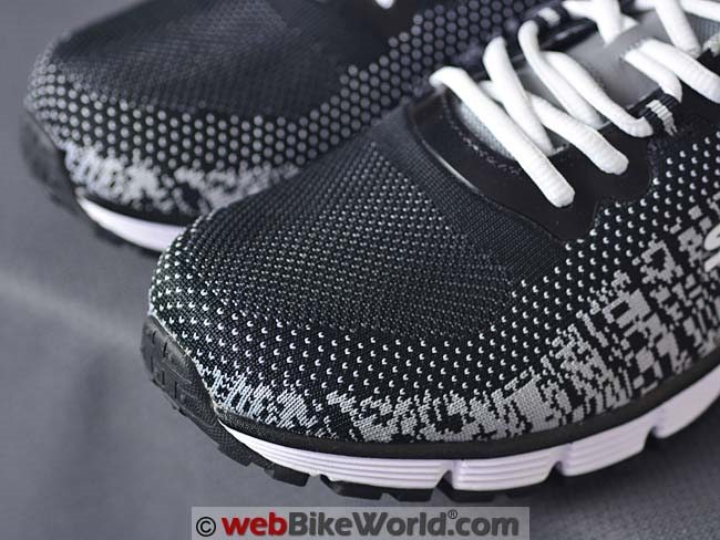 In fact, because of the one-piece knit uppers, the only stitches on the entire show are two rows holding the reflective loop in the rear and a single small row across the front of the vinyl lace reinforcement, at the front of the laces.