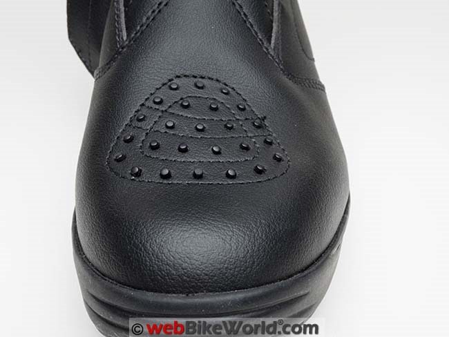 On the top of the toe box of the the left boot are 25 small raised hard rubber (or soft plastic?) nibs that protect from and maintain grip on the shift lever.