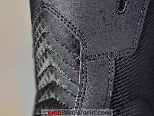 Back on the outside, the shift and brake pads are stitched on the toes of their respective boot, while small triangles of reflective points on the lower-to-upper calf transition sections provide some retro-reflectivity (depending on whether pants are worn in or out of the boots).