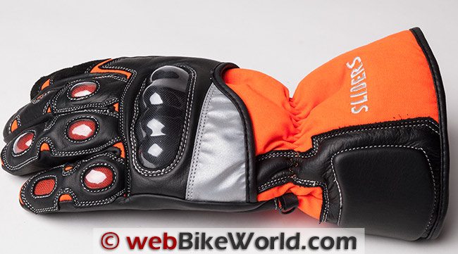 The bright high-viz orange on this particular pair does make them stand out here but otherwise they aren’t too flashy, with just a simple embroidered “Sliders” logo on the back of the gauntlet.