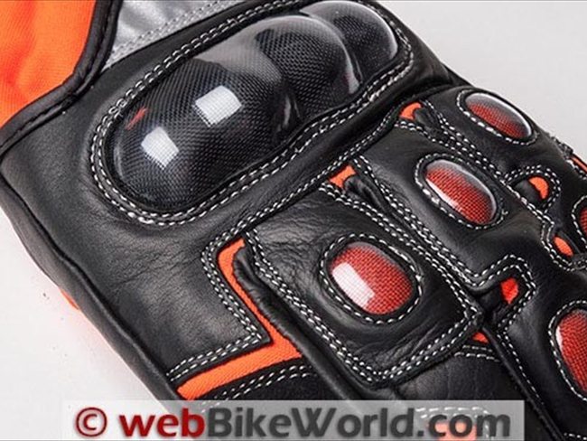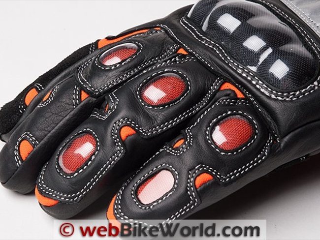 The top of each finger is initially covered with the same textile that makes up the gauntlet and the area of the back of the hand. On top of that is a layer of leather with the plastic impact protectors mentioned above.