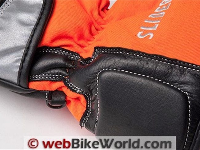 At the heel of the palm as well as on the outside facing section of the gauntlet is a section of leather covered foam padding. Although most of the gloves stitching is doubled, these two foam padded areas only get one row.