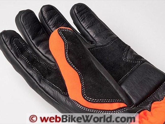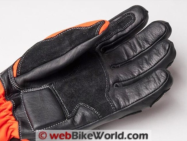 The palm is entirely leather and across the palm and on the underside of the index finger is an additional patch of the “goat suede” leather for increased abrasion resistance.