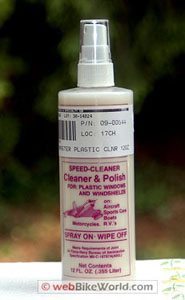 We evaluated Speed Clean by comparing it to other cleaners like Glass Plus (a staple in the webBikeWorld garage but getting very difficult to find lately, for some reason); a generic “Green” non-ammonia general purpose spray cleaner; ProtectAll (review); and AutoGlym (review); a British product that is similar to ProtectAll (but with a better smell!).