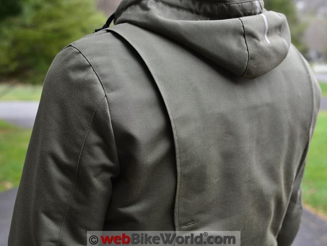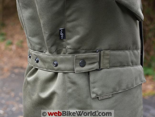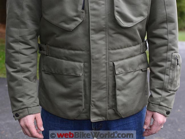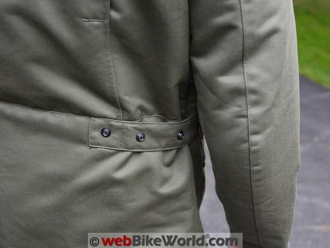 The waist adjusters are on the outside, a concession to motorcycling use because normally the waist adjustment on a military field jacket is done via a drawstring on the inside.