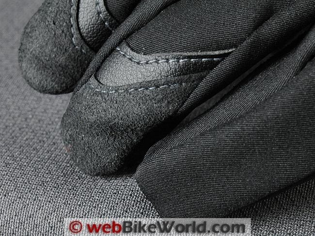 The fingertips of the middle finger, third finger and pinky finger and the side of the hand have a covering of what feels like a nubuck or roughout type of leather.