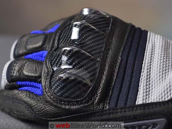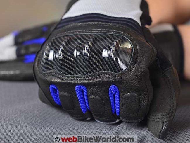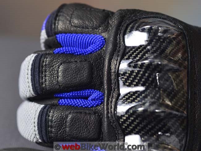 The big main carbon fiber knuckle protector is also the primary styling feature of the TX-2 gloves. The molding of the knuckles is interesting; it’s sharper or more pointed than other carbon fiber main knuckle protectors I’ve seen on motorcycle gloves.