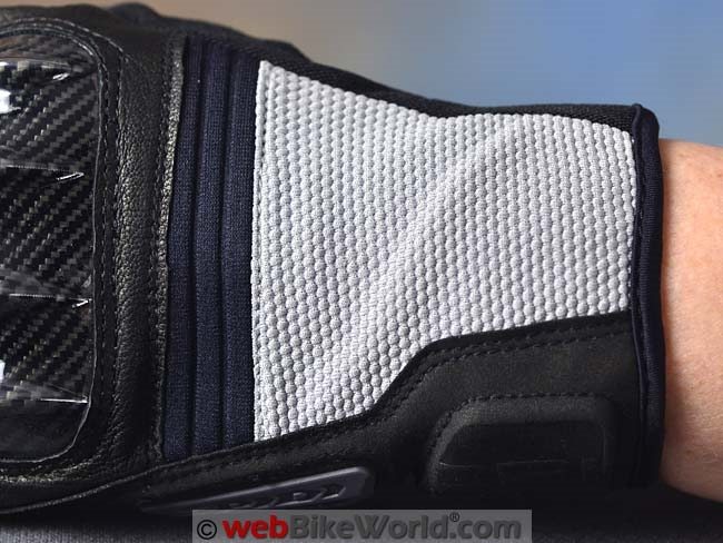 The fabric used over the back of the gloves (over the wrist) is some type of polyester, but it’s not the “classic” style open-weave mesh (although a touch of that type is used to cover the bottom half of the thumb).