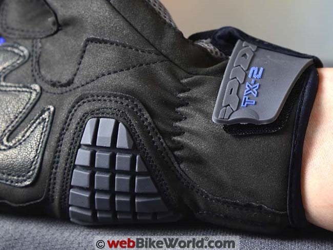 There are two more materials to be found on the TX-2 gloves: the large main knuckle protector is a nice piece of carbon fiber molding, while the outside of the wrist is protected by a big section of soft waffled polyurethane double-stitched into the glove body.