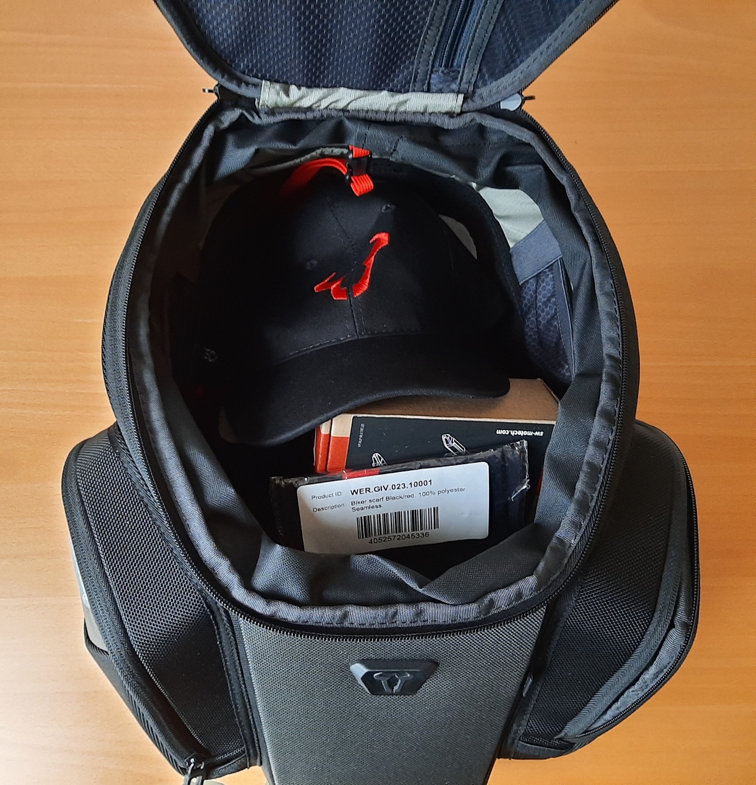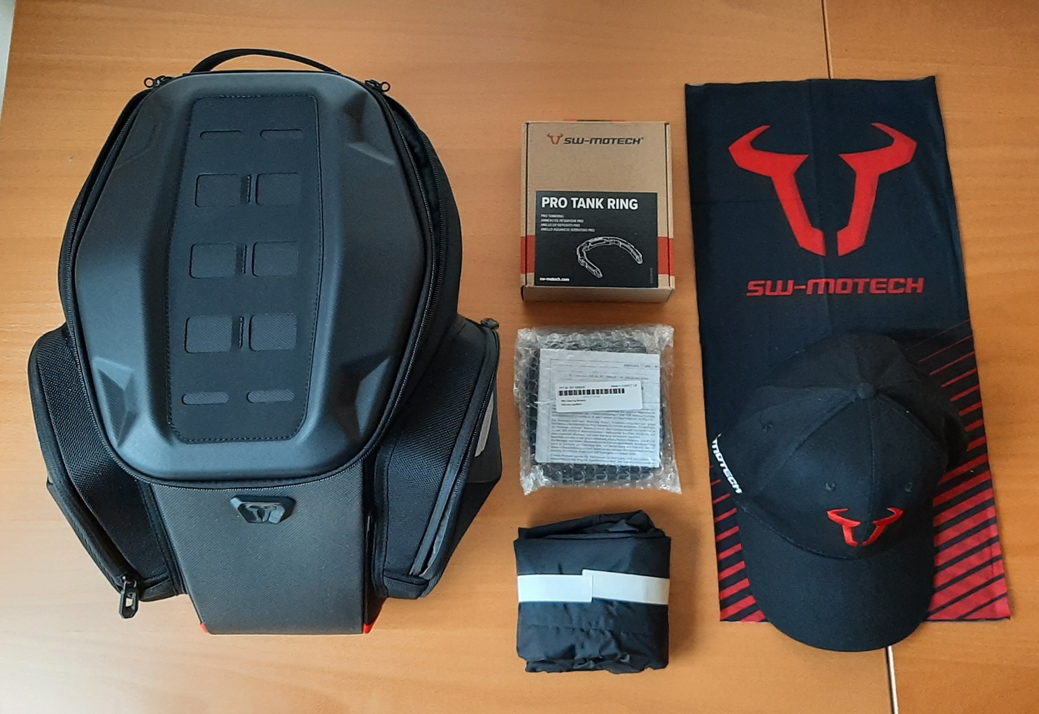 Included in the SW-Motech PRO GS kit is the PRO GS Tank Bag with integrated bottom mounted adjustment base and the PRO Tank Bag Upper ring or adjustment plate – loosely pre-fitted to the adjustment base. The rain cover, mounting instructions and small bag of mounting hardware, along with the Pull & Release strap should be packed inside the tank bag itself.