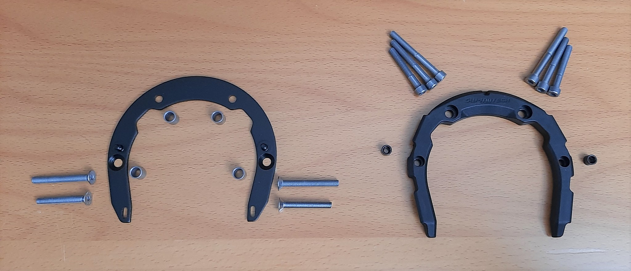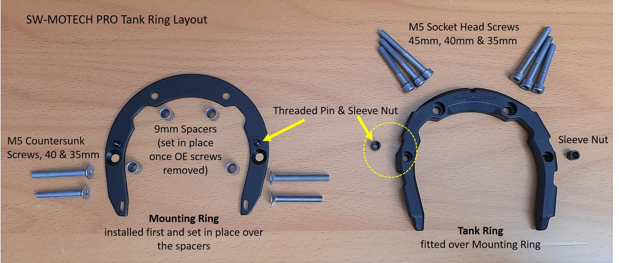 Included in the SW-Motech PRO Tank Ring kit is the dimensional Tank Ring with the Fidlock magnet layout, the flat Mounting Ring, sets of M5 x 40 and 35mm countersunk screws, two 9mm spacers, sets of M5 x 35/40/45mm socket head screws, two small black sleeve nuts and the two-page double-sided instructions.