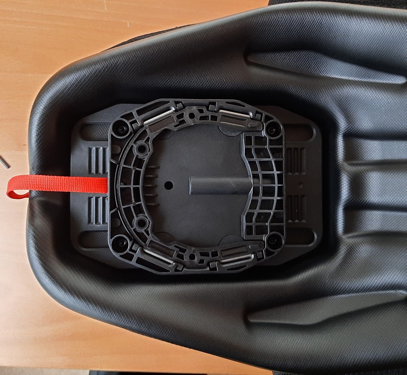 With the strap connected and routed and the adjustment plate fitted in place (mid-point is good), install the screws but leave the assembly loose; now fit the tank bag onto the tank ring. With the adjustment plate free to move back and forth against the ridged surfaces, the tank bag is easily positioned (forward or backwards) with the two ridged surfaces engaged.
