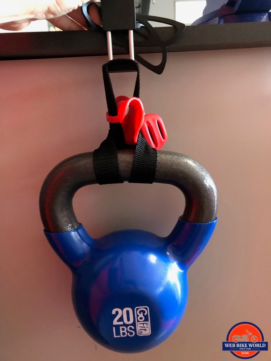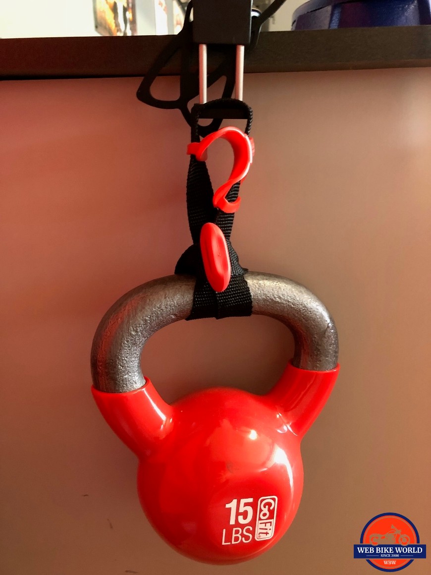 What I ended up doing was suspending a kettlebell from the cradle to see how well the spring could support the weight. I started with a 15-pound kettlebell and was pleased to find that the spring was unphased by the weight. It snapped crisply back to the closed position.
