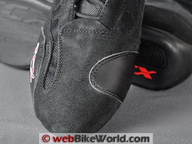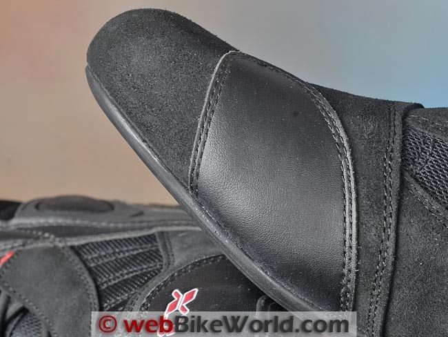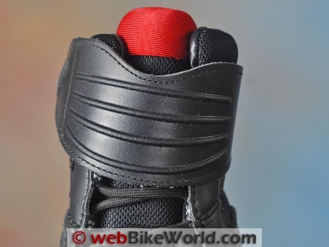 A wide leather strap is placed across the top of the ankle to help keep the laces from fouling in the foot pegs, although it’s not long enough or wide enough to fully guard the lace loops, as it is on the REV’IT! Air Blend Fighter boots (review).