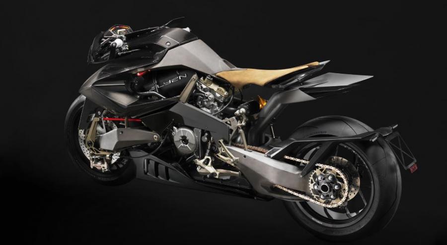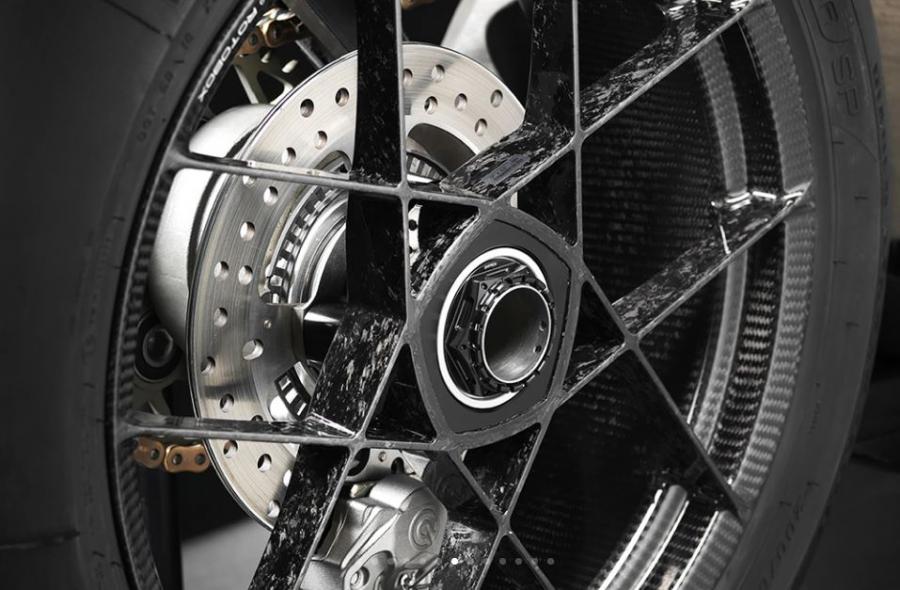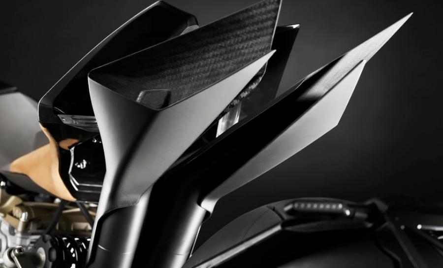 The bike almost looks front-end heavy with the unique steering and suspension linkages and the large fairing. The styling is all full of sharp angles and dark gray panels and carbon fiber. It’s a bike that is sure to catch your eye. The bike also gets carbon fiber wheels, a unique tan seat, and a magnesium double omega design frame.