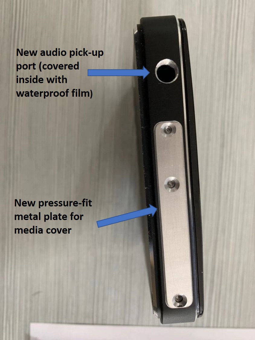 The original module housing used a weather resistant silicone flap on the top edge to hide the (reserved use/power only) micro-USB port, micro-SD slot, and a small pinhole audio pick-up.