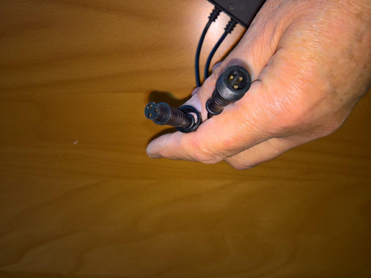 The second group exits as a three-wire (output) cable from the top left of the converter module. The cable terminates in a waterproof connector that is mated to its (keyed) counterpart on the flying lead of the DVR.