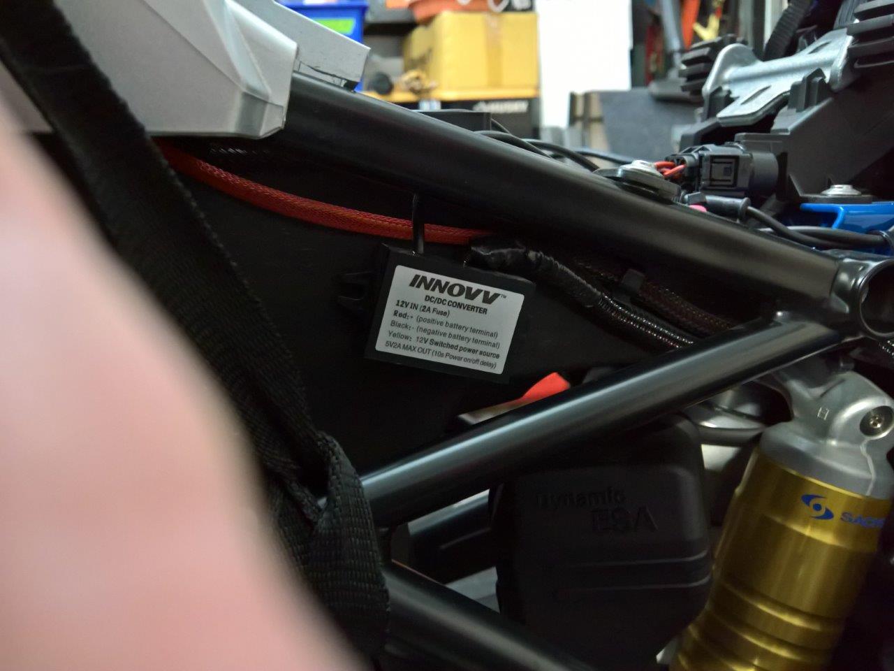 As the K2 12/5V DC Converter module is sealed, it is stuck to the left outer side of the under-seat housing right next to one of the ~24mm oval holes found on both sides of the deck housing.
