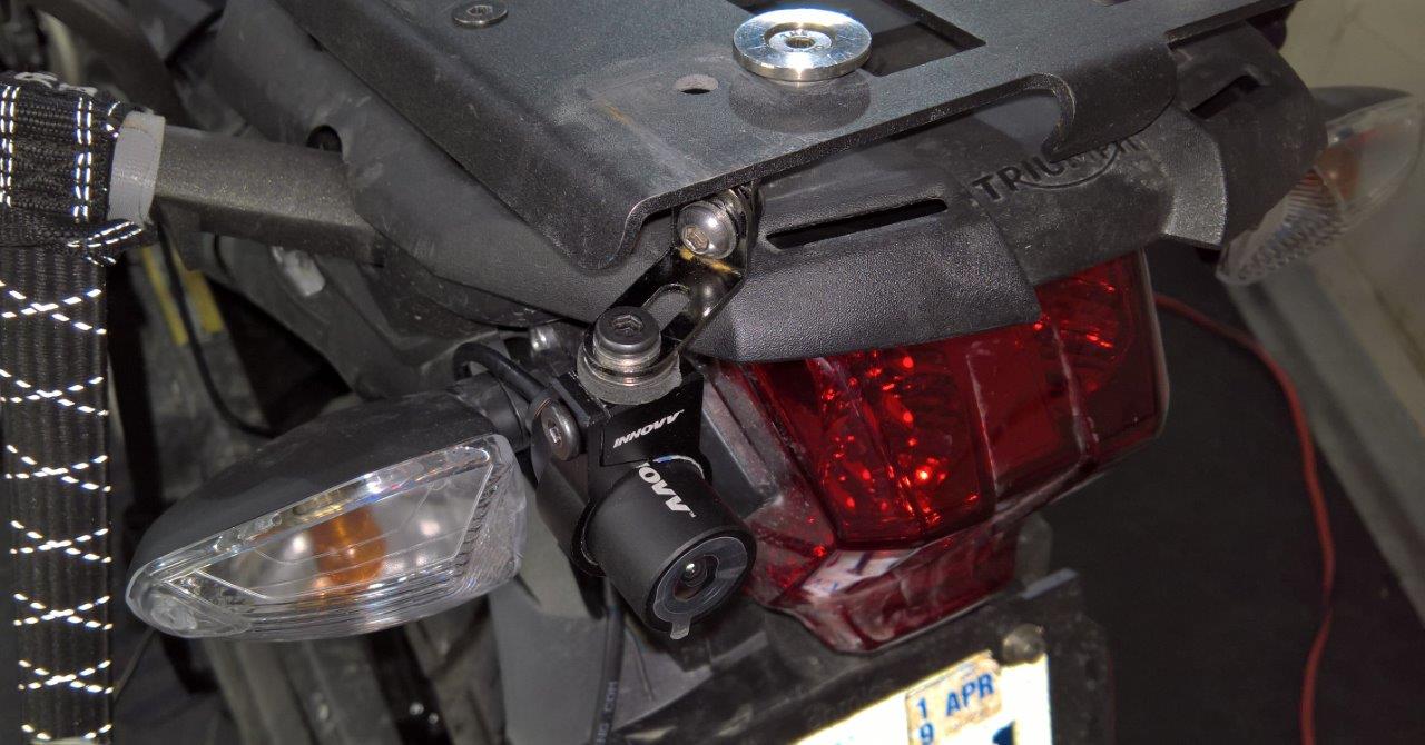 The K2 rear camera mounts to a shaped light steel L-bracket that shares a mount with the adapter plate for a SHAD ST38 aluminum top box (a prototype that never made it to market).