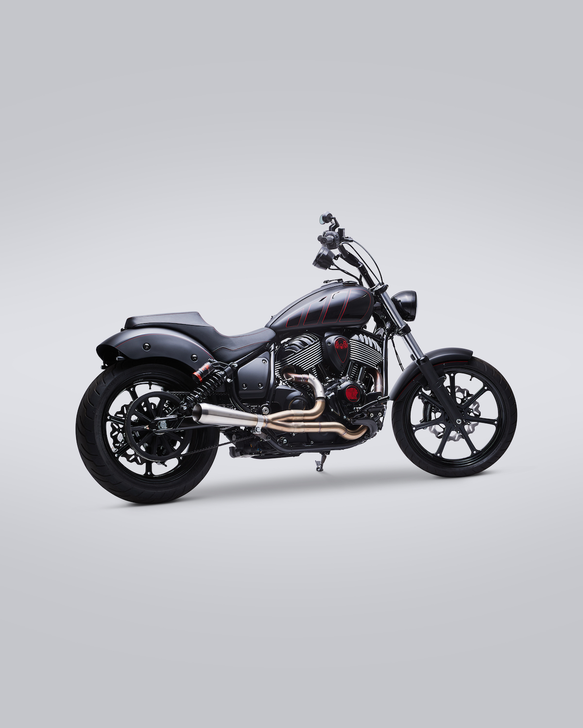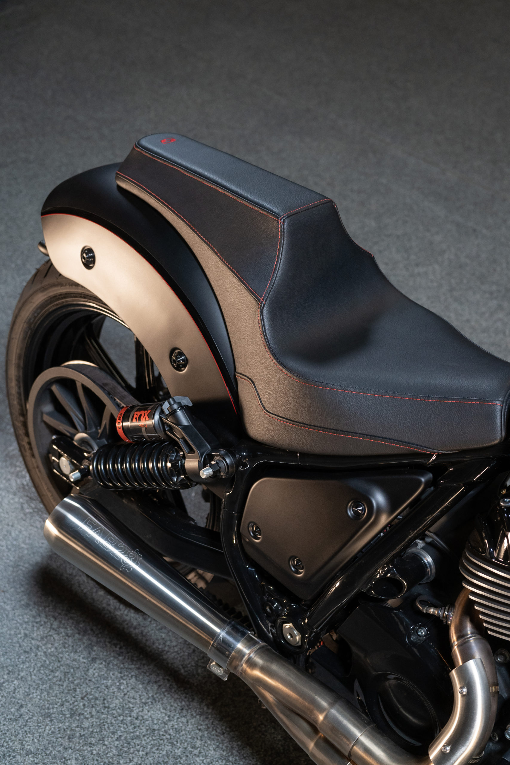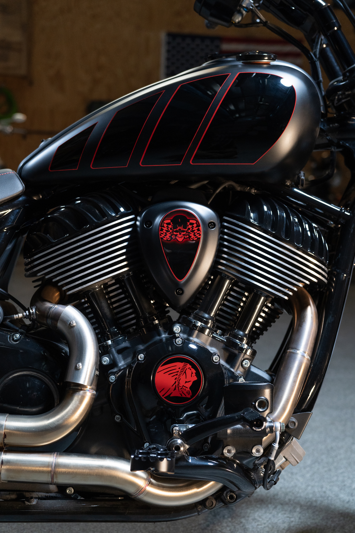 The build features a sooty, sleek black color scheme with red detailing and chrome peekaboos (the most noticeable being the Fab 28 two-into-one stainless steel exhaust).