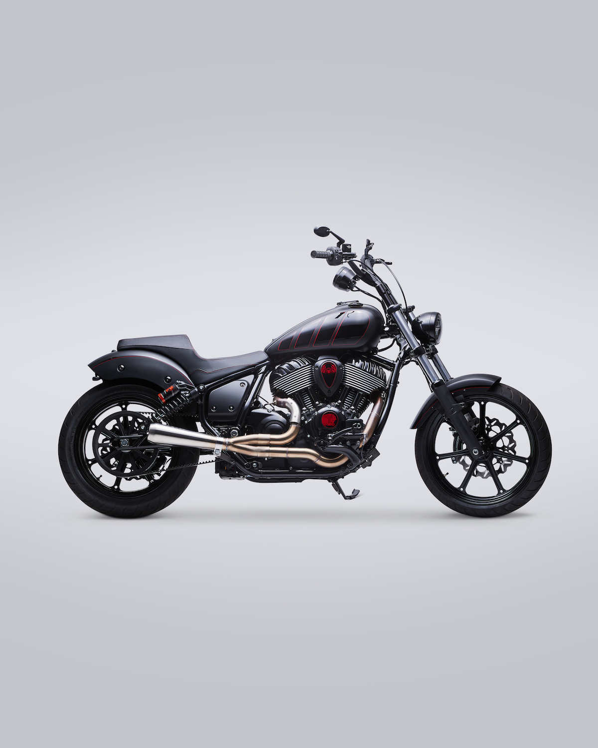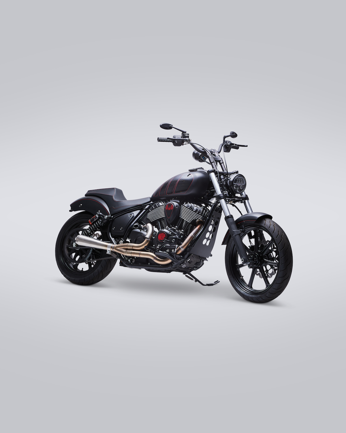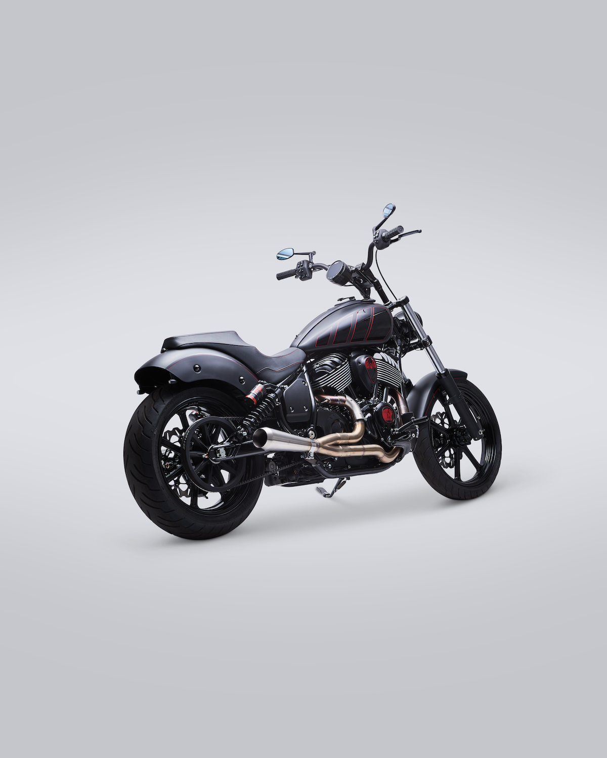 The build features a sooty, sleek black color scheme with red detailing and chrome peekaboos (the most noticeable being the Fab 28 two-into-one stainless steel exhaust).
