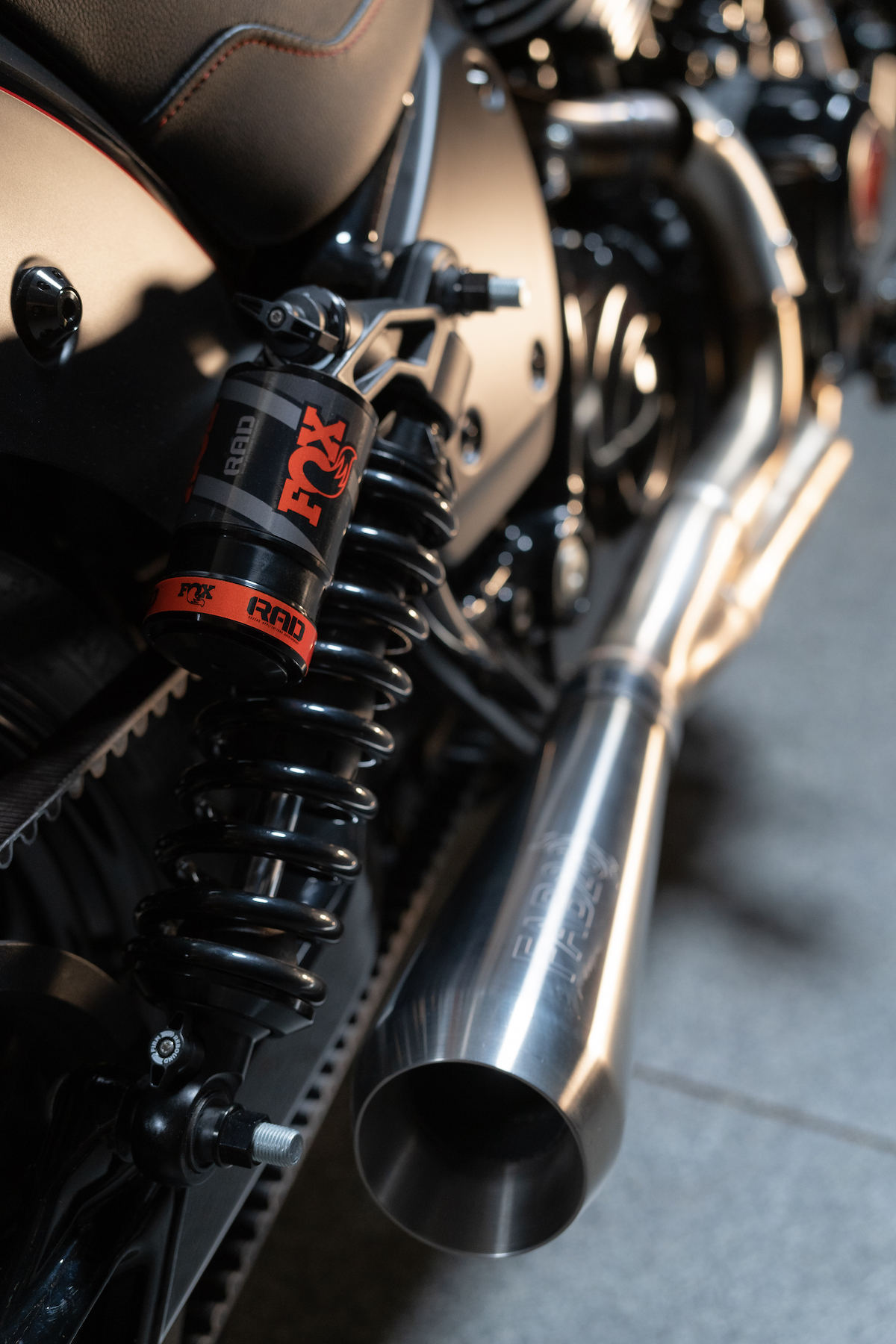 Riding on Dunlop tires are custom San Diego wheels, on top of which sits the Saddlemen Hart Luck seat, Fox Piggyback shocks and San Diego Customs shifter, brake pedal and pegs package.