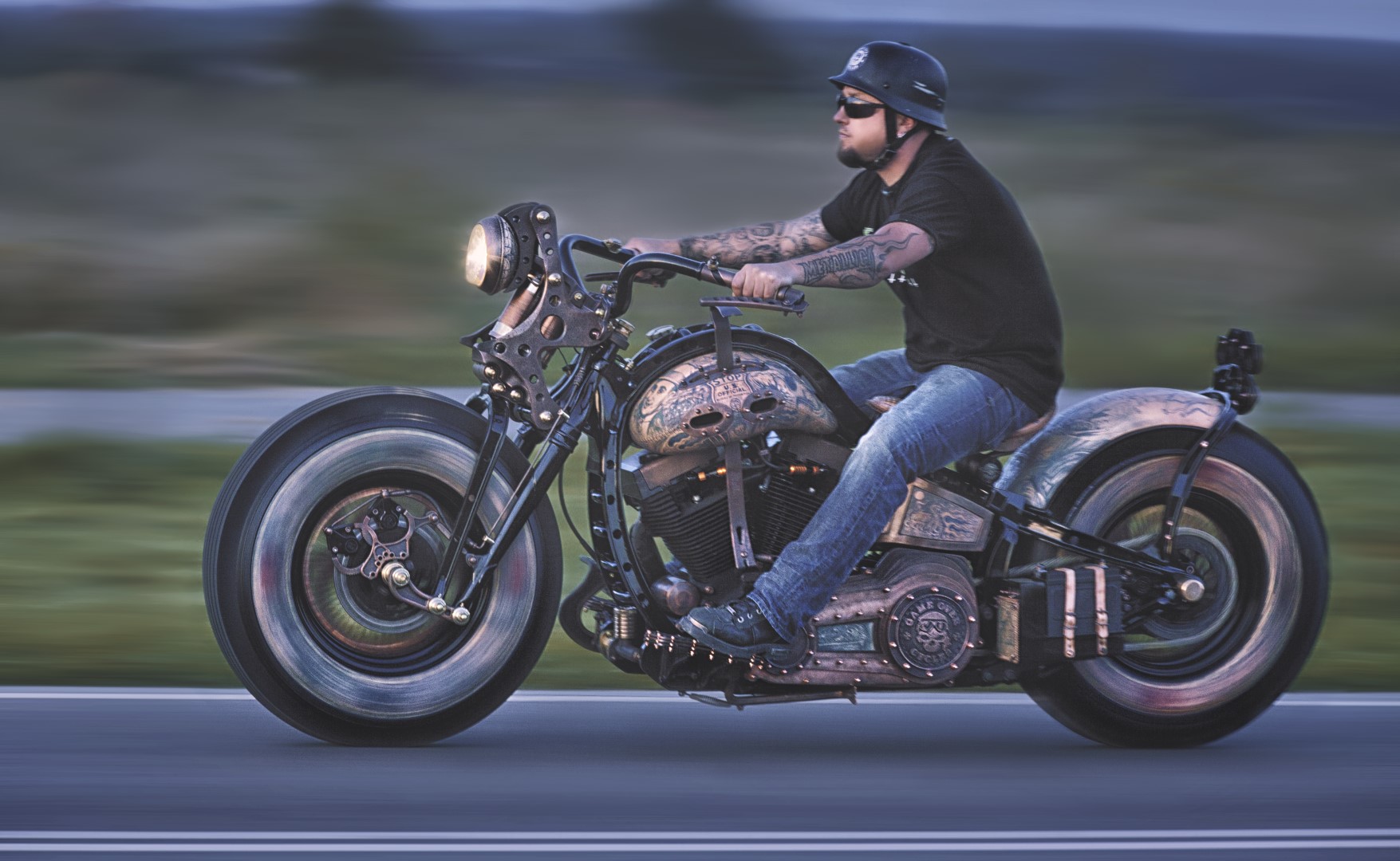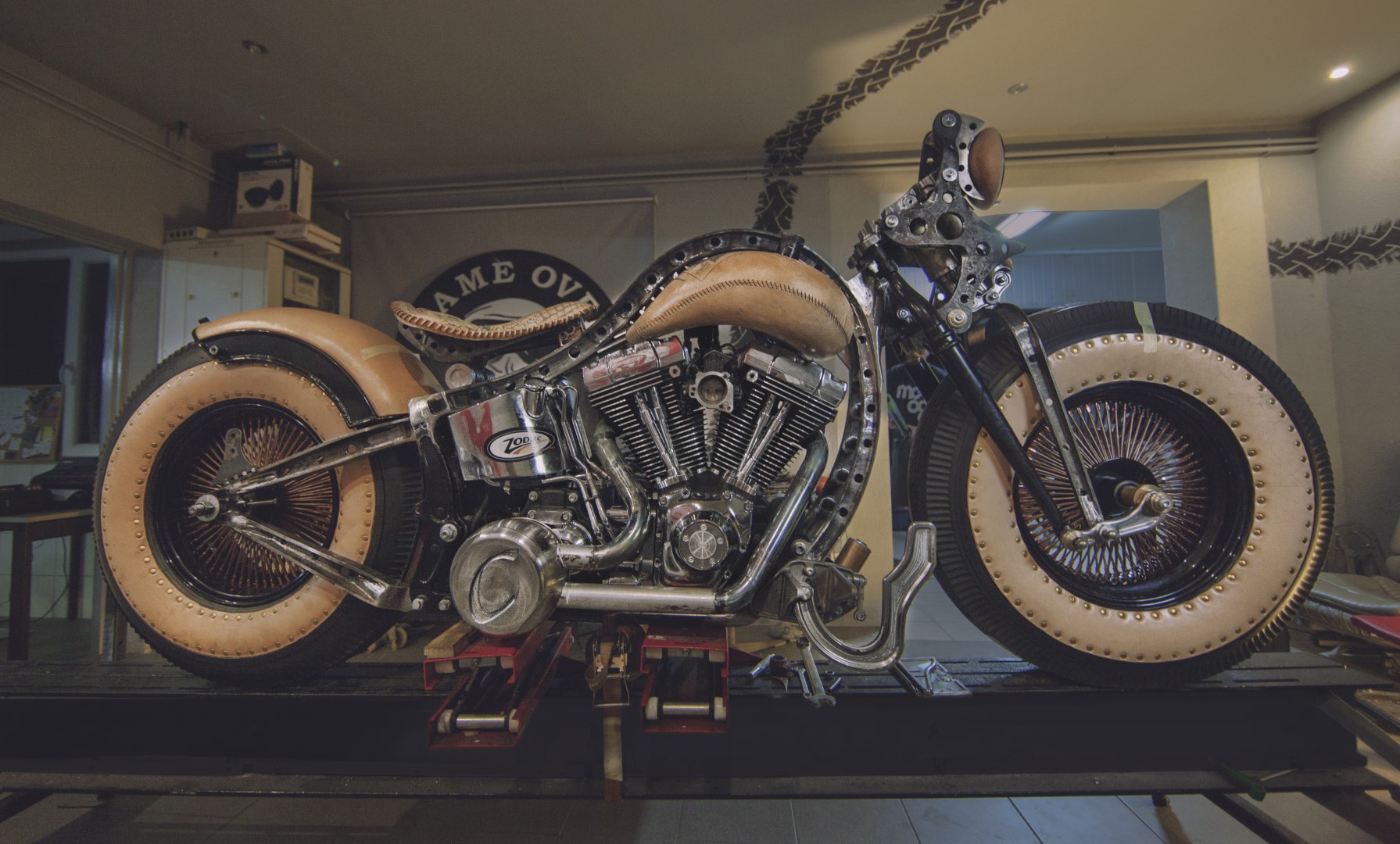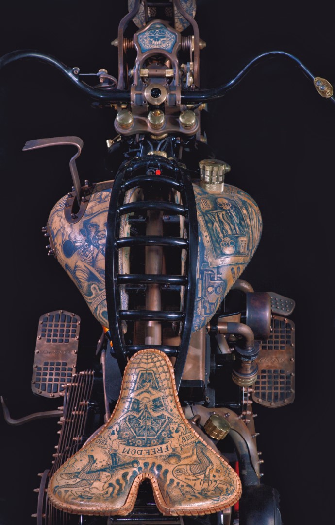 In short, this is a wonderful work of art. It’s interesting and different. Even if you don’t like it you have to acknowledge the craftsmanship and the time and effort that went into making the bike. According to Game Over Cycles, more than 3,000 hours went into the construction of the bike. Another 2,500 hours went into tattooing the leather on the creation.