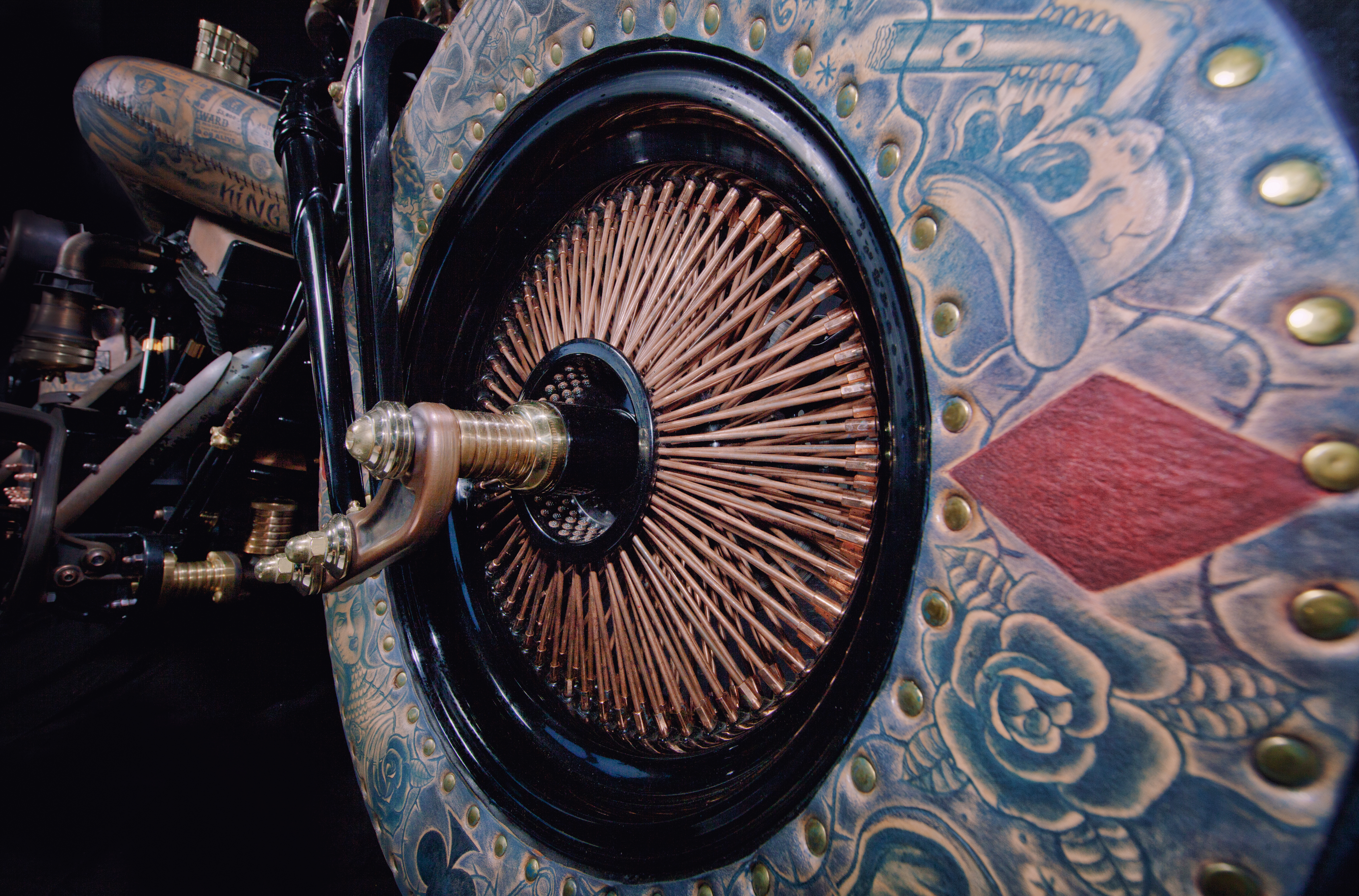 Okay, so you can’t actually tattoo metal, so the bike has been completely and artfully wrapped in a thin layer of cowhide leather. In the video below the voiceover says the light color of the leather looks a lot like human skin. I found this to come off very serial-killer-ish, but I get the connection.