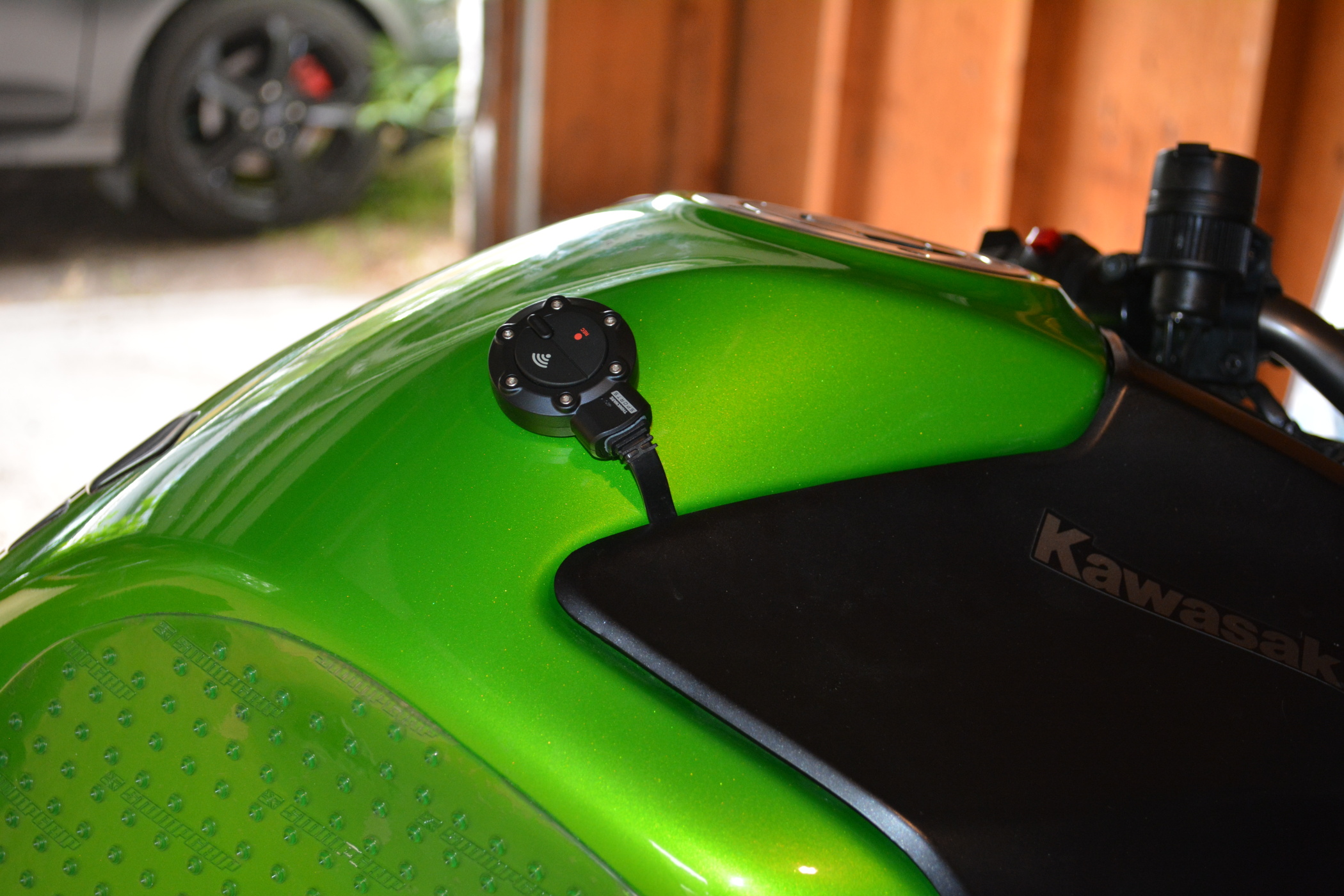 The last thing to do before reassembly of my bike was to locate the control toggle, and I was debating between mounting it to the right of my dash, or on the side of the tank, as the cable would reach both locations. I decided on a tank mount, because I could bring my hand back quickly enough to tap the manual recording button to capture an event while holding in the clutch and get it back to the throttle in about a second, without needing to look down or fiddle about to find it.