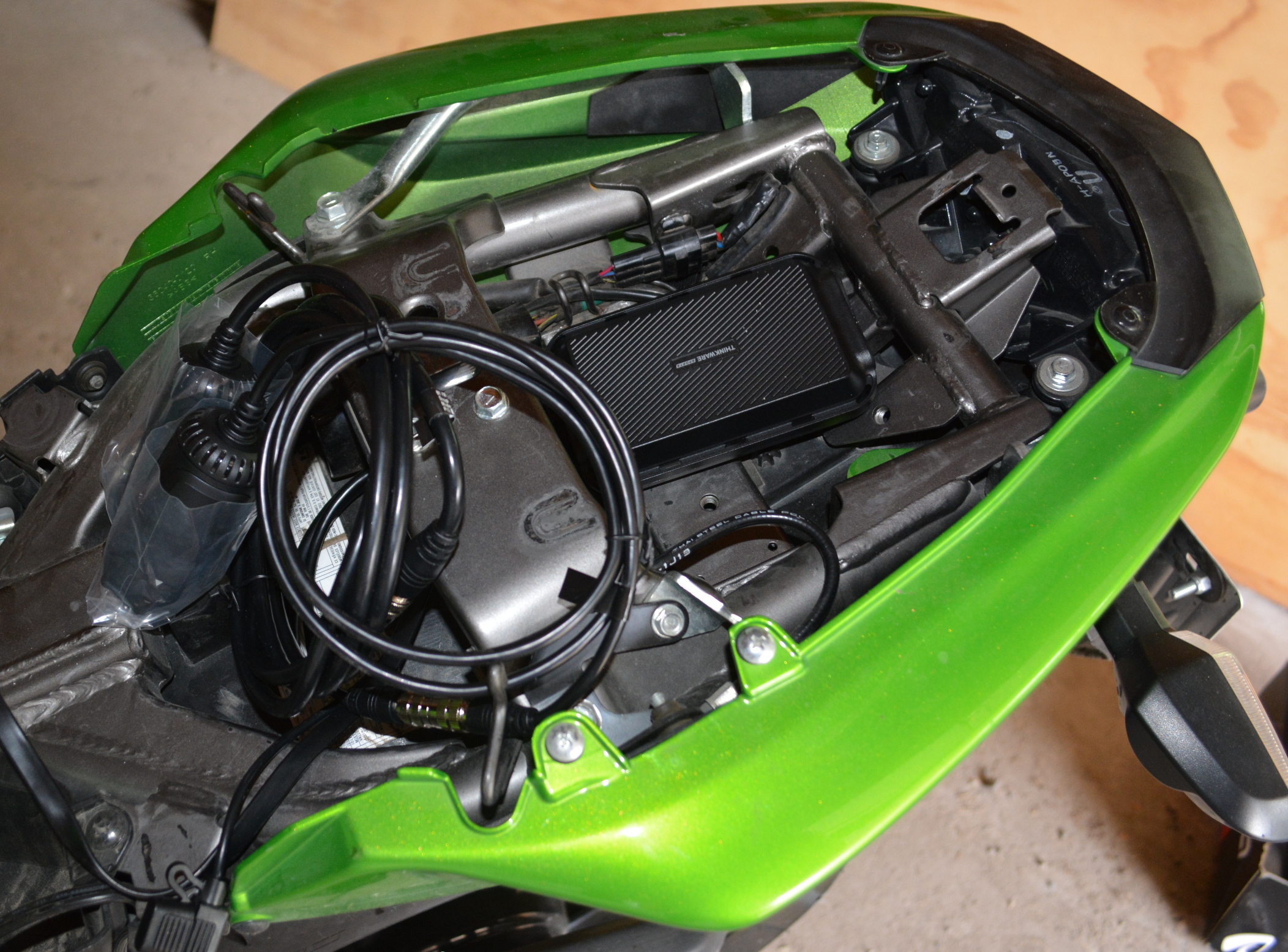 With the 2012 Kawasaki Ninja 650, the area directly under the main saddle is packed full with the battery, air box, and other assorted bits, making the tail section under the pillion seat the only viable space for the control box.