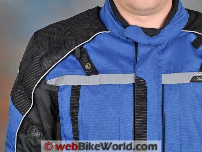 This consists of vents that open along the lower edge of the black shoulder protector material, just under the Phoslite reflective piping that can be seen in the photos.