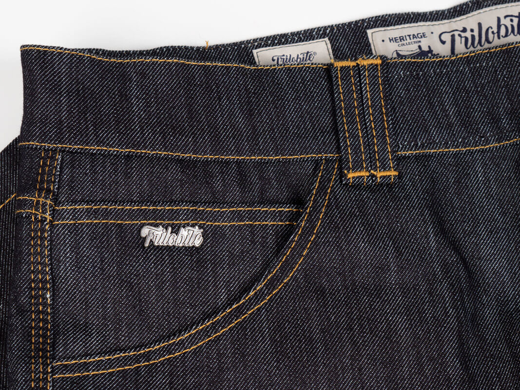As far as the overall style, they are very much the traditional five pocket jeans on the outside. A zipper (YKK) and large button are used for the main closure. On the left pocket there is a singular rivet at the pocket corner seam embossed with the Trilobite graphics and in the upper portion of the right pocket, a small metal “Trilobite” logo is present.