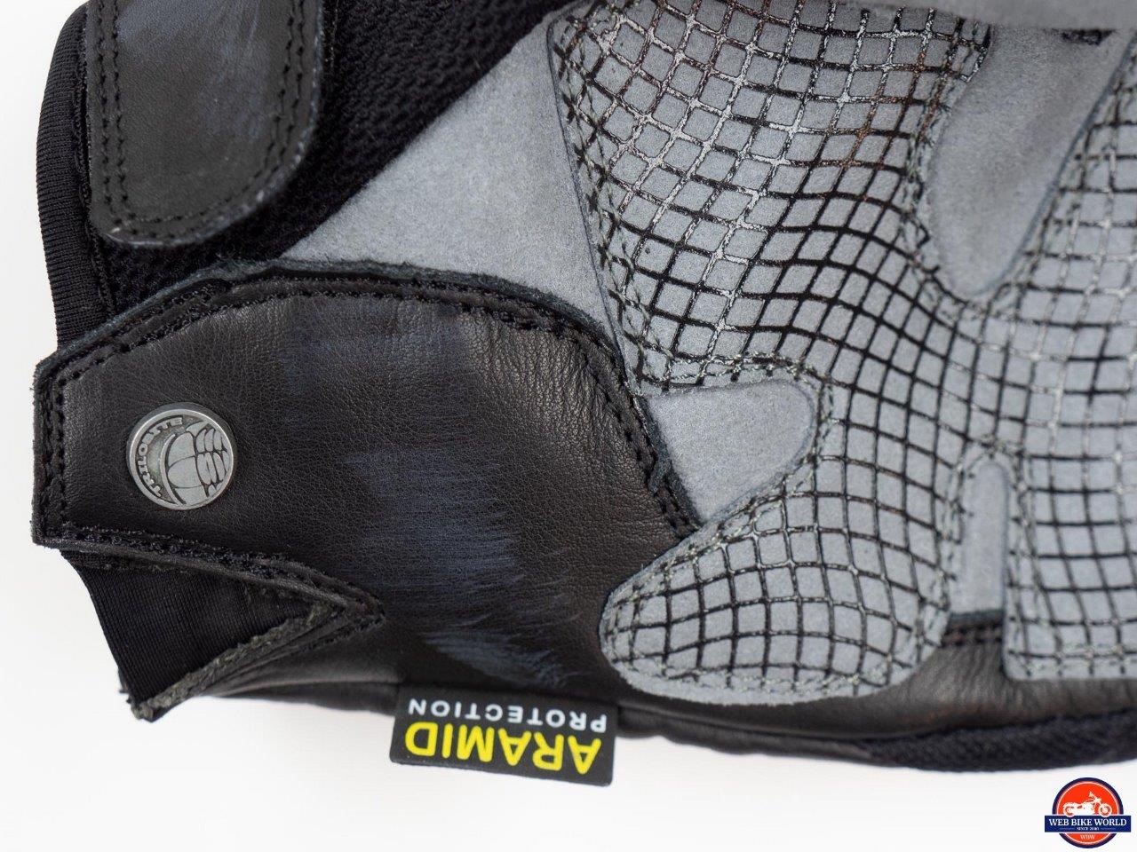 The other main piece to the protection puzzle is the aramid lining. The entire underside of the palm and fingers is lined with the pale yellow abrasion resistant material. This sits underneath the synthetic leather exterior which is also covered with a layer of plastic “gripper”. I think this area should hold up pretty well in most situations. It might even protect from road rash in a low-speed slide on the street but that’s just a guess on my part. I don’t recommend finding out 🙂