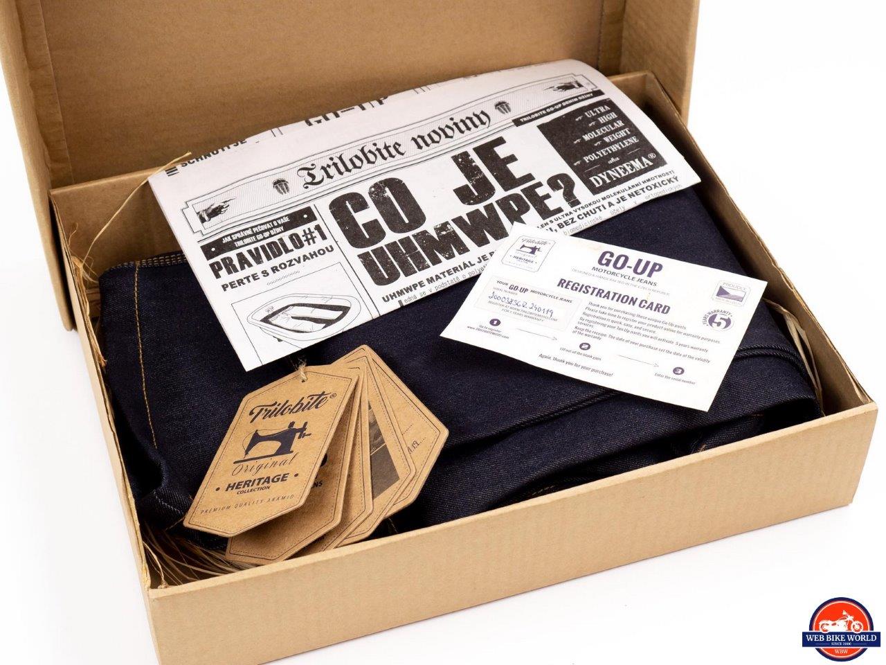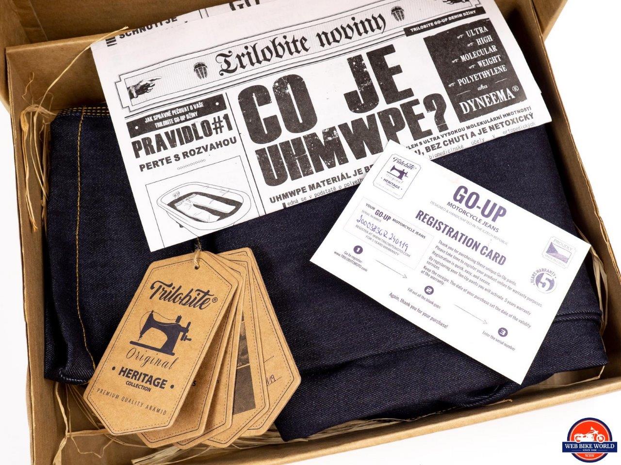 The packaging has a style all it’s own just like the Go-Up jeans do. A cardboard box with shredded paper filling the interior around the jeans. There is also a single newspaper-style page with info and “stories” about the Dyneema material and other features about their jeans. This is all in Czech so I’m unable to read it but it’s a neat touch nonetheless.