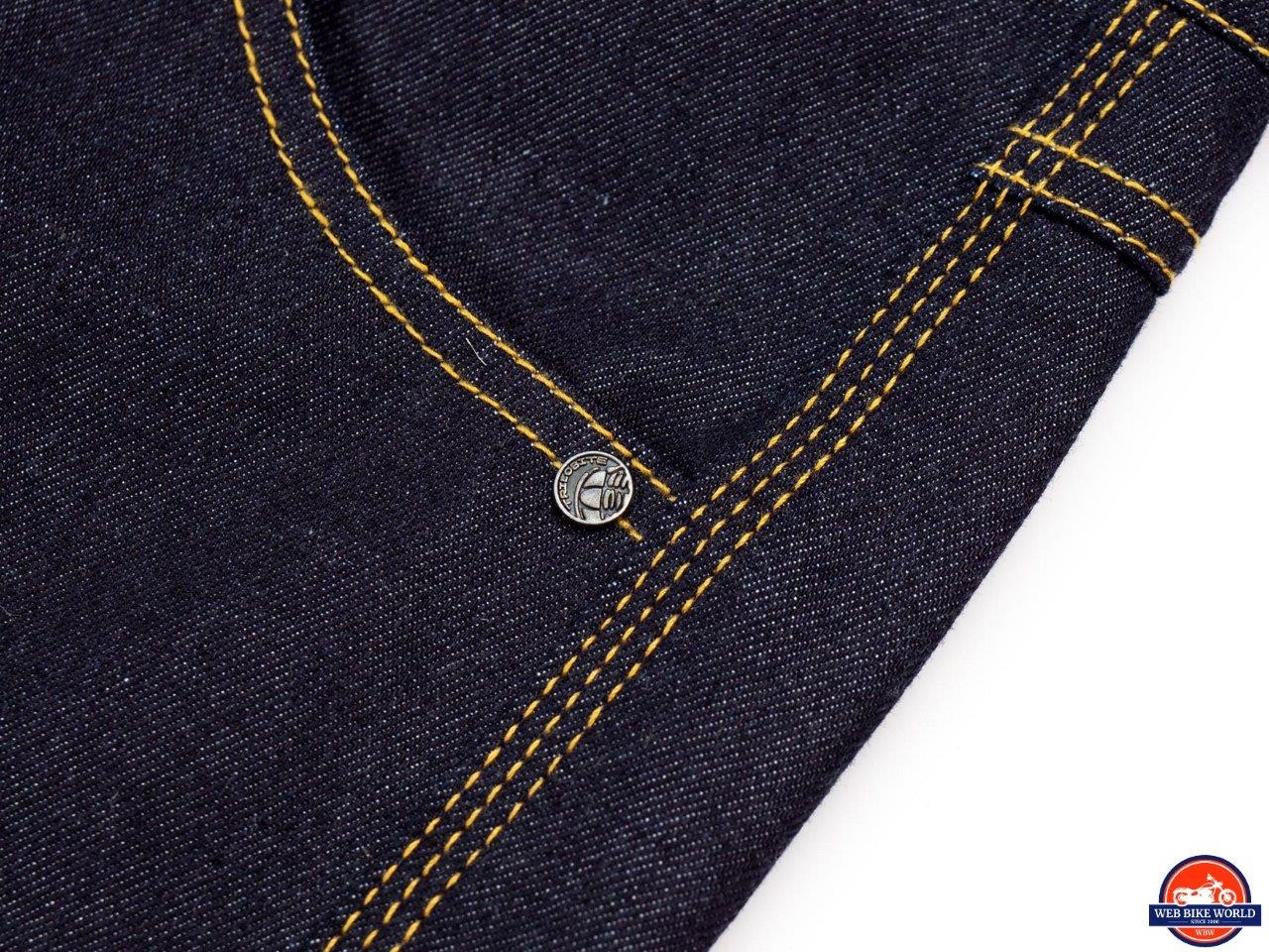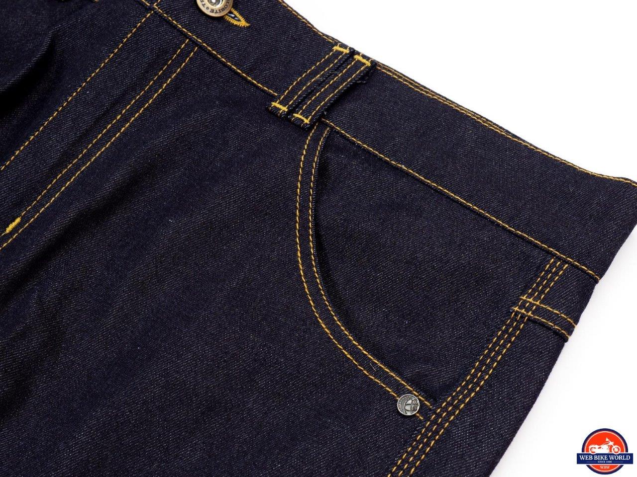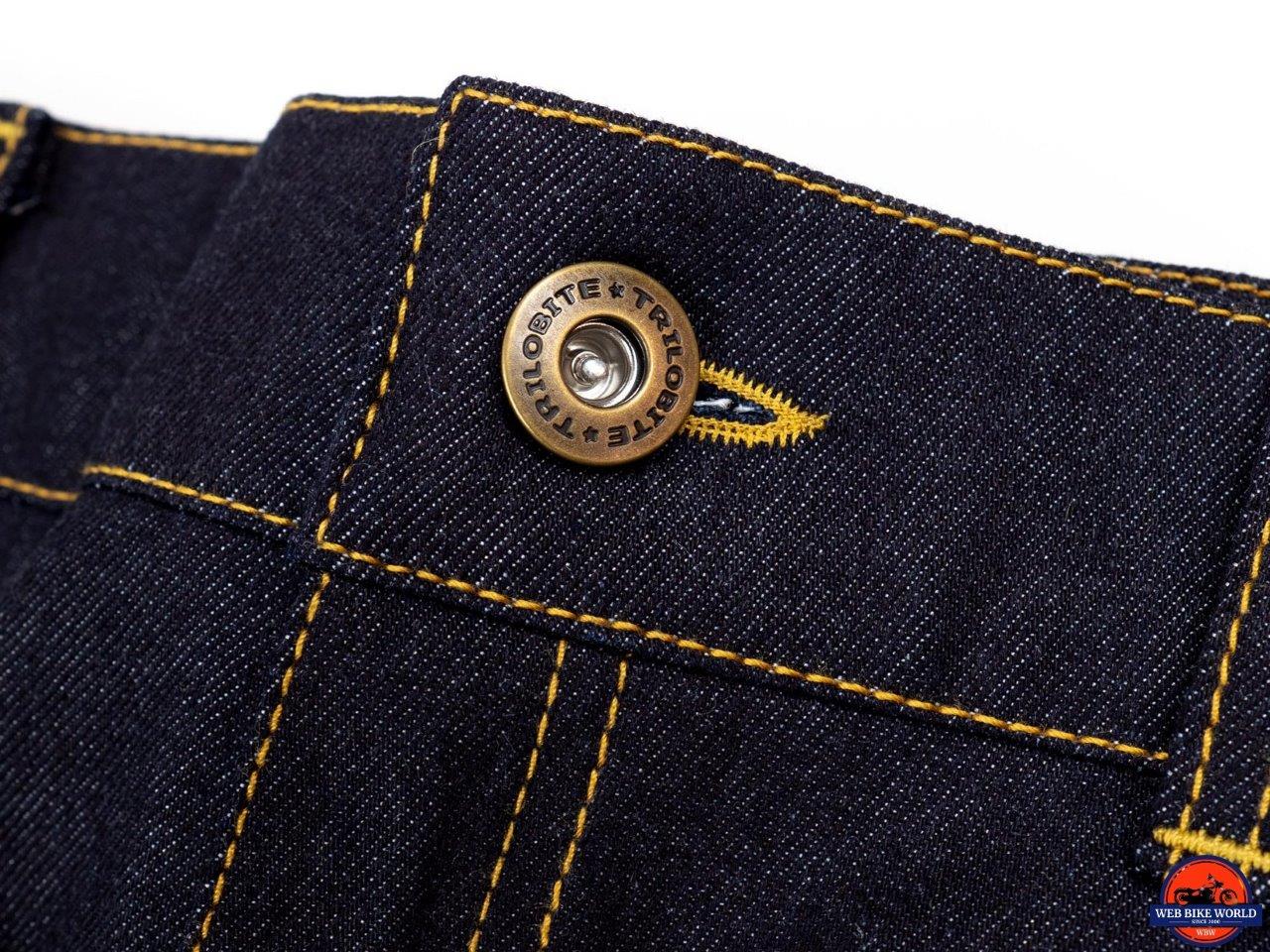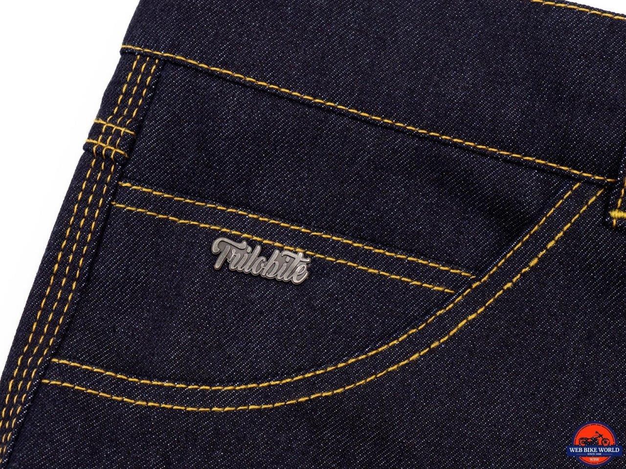 The Go-Up jeans are a study in simplicity, at least on the surface. The appearance is pure and simple blue jeans – dark blue denim with yellow-orange stitching, five* pockets, a button fastener, and a metal zipper. Except for a small metal Trilobite logo riveted to the coin pocket and ”Trilobite” embossed on the button, these jeans are stealthily giving no indication they are protective riding gear.