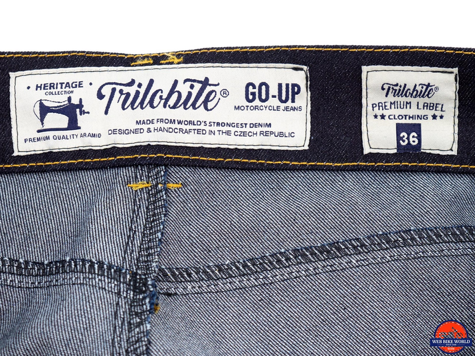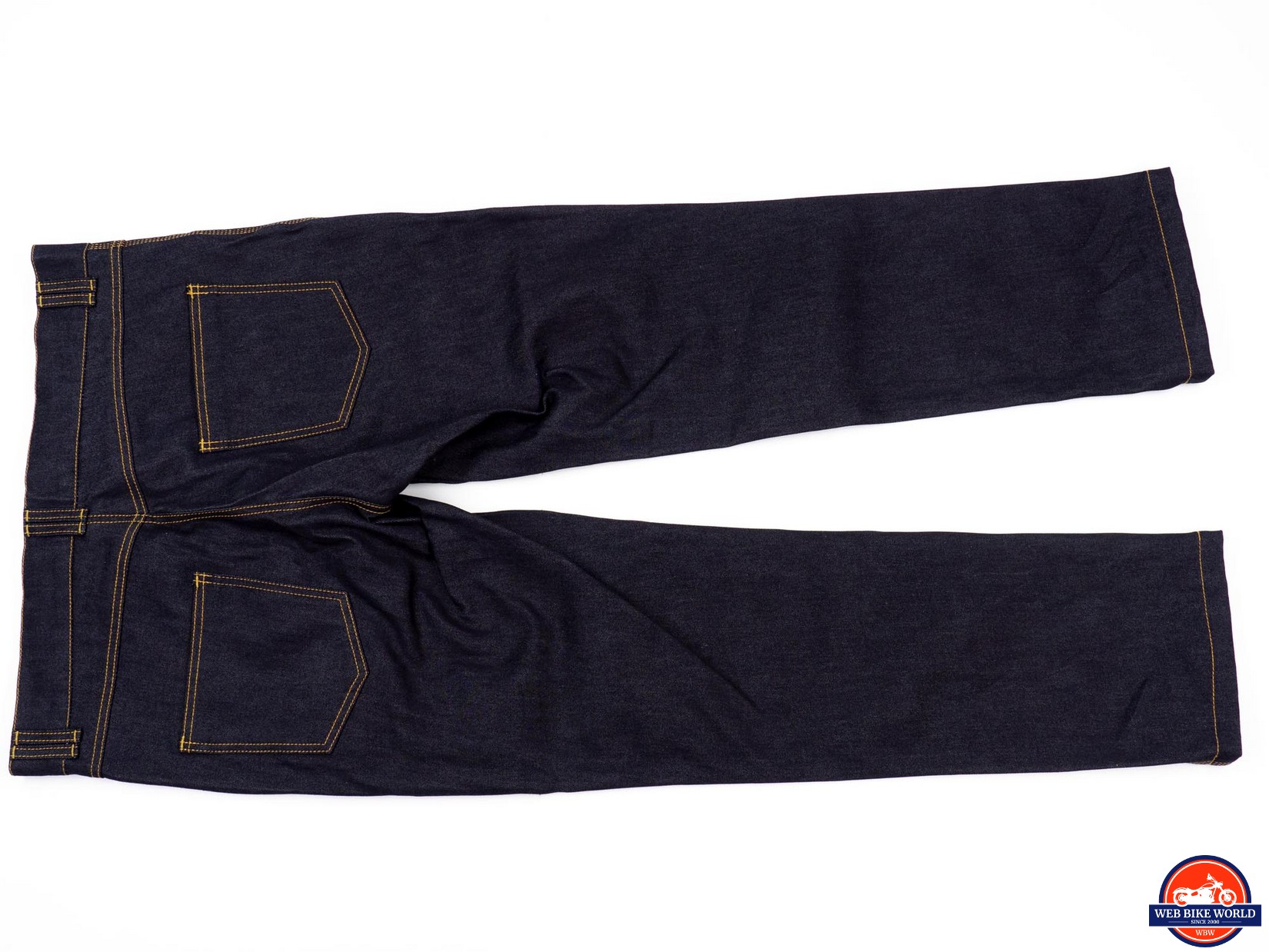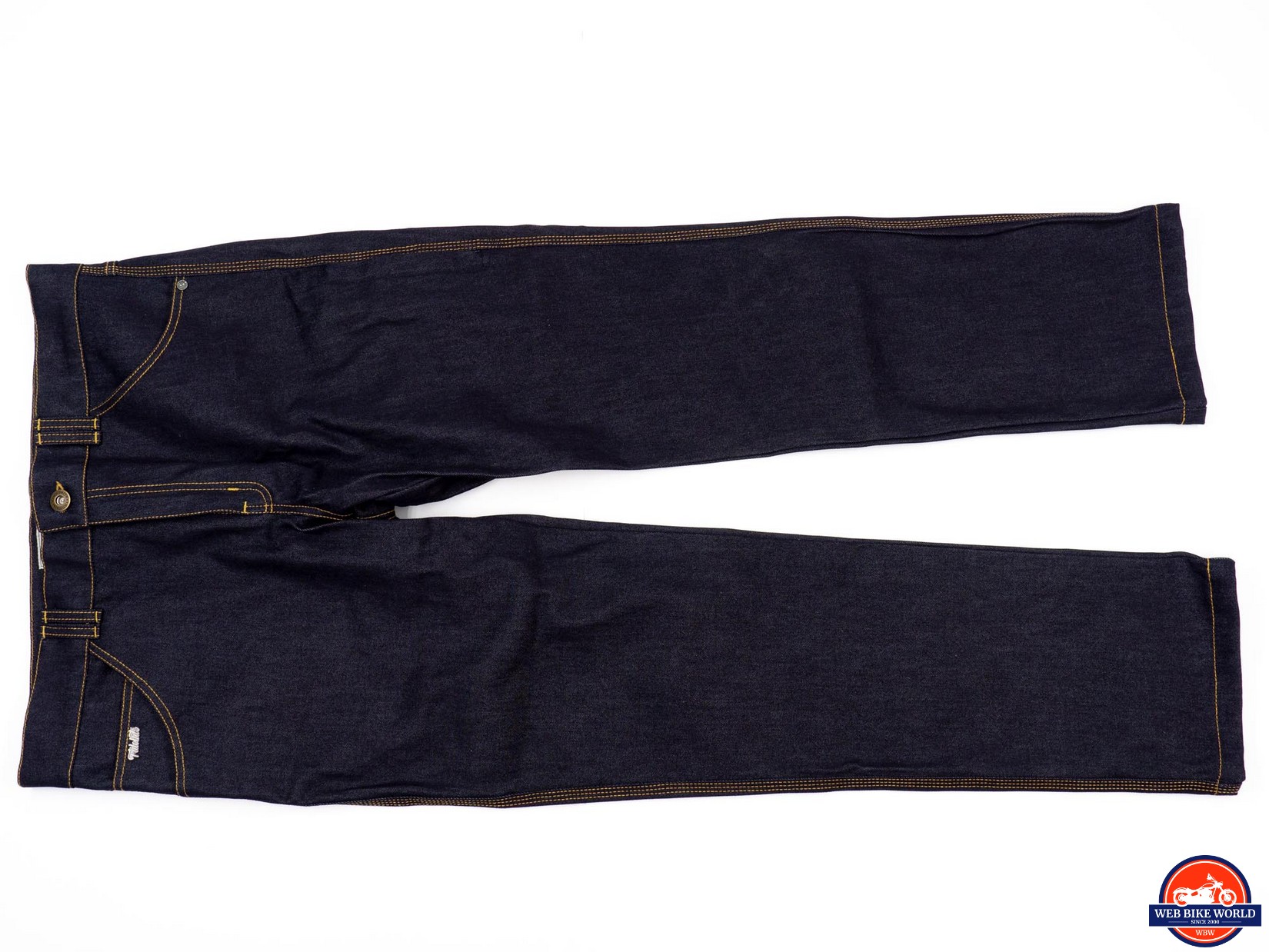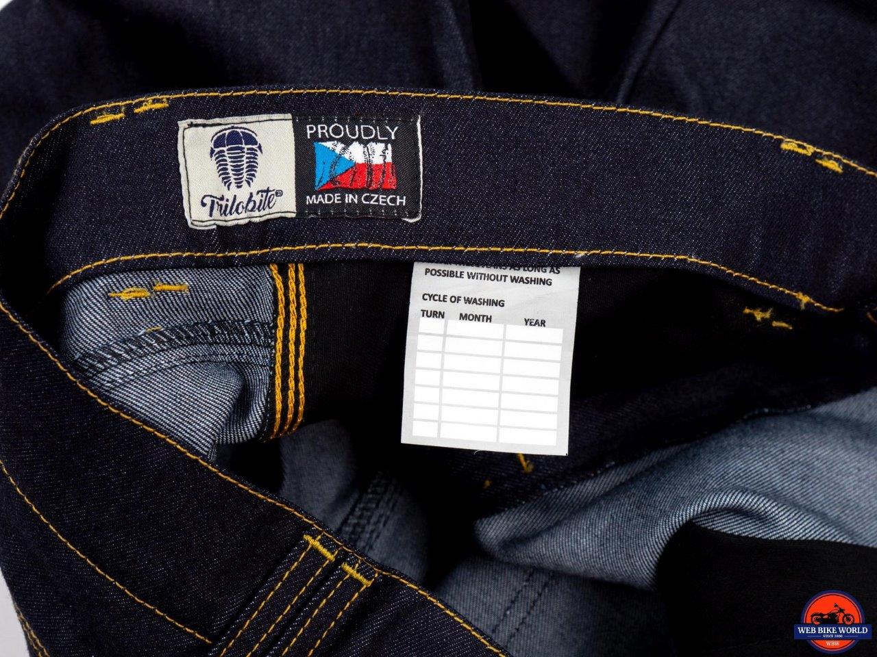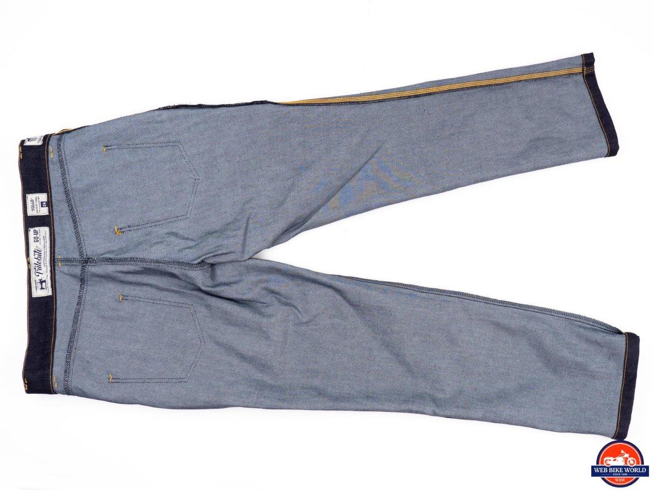The Go-Up jeans are a study in simplicity, at least on the surface. The appearance is pure and simple blue jeans – dark blue denim with yellow-orange stitching, five* pockets, a button fastener, and a metal zipper. Except for a small metal Trilobite logo riveted to the coin pocket and ”Trilobite” embossed on the button, these jeans are stealthily giving no indication they are protective riding gear.