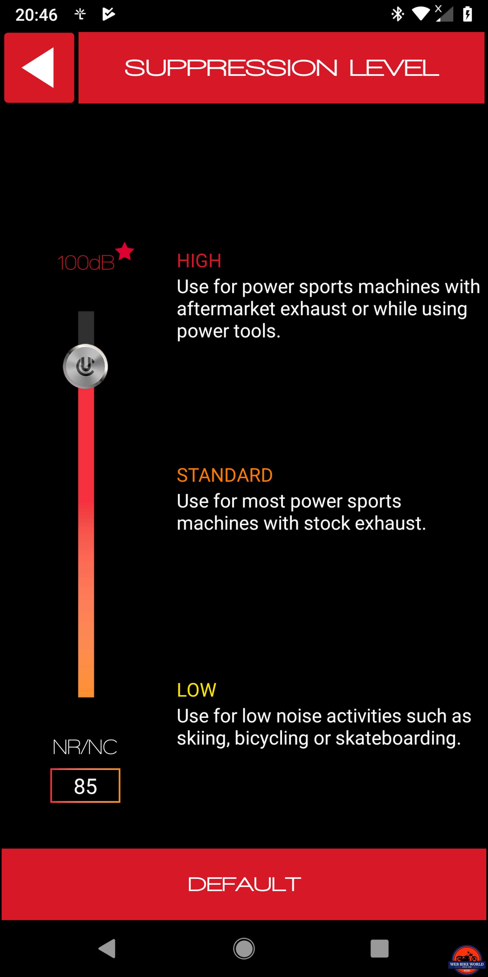 - Suppression Level Sub-menu choices, sliding scale – Low > Standard > High (100dB)