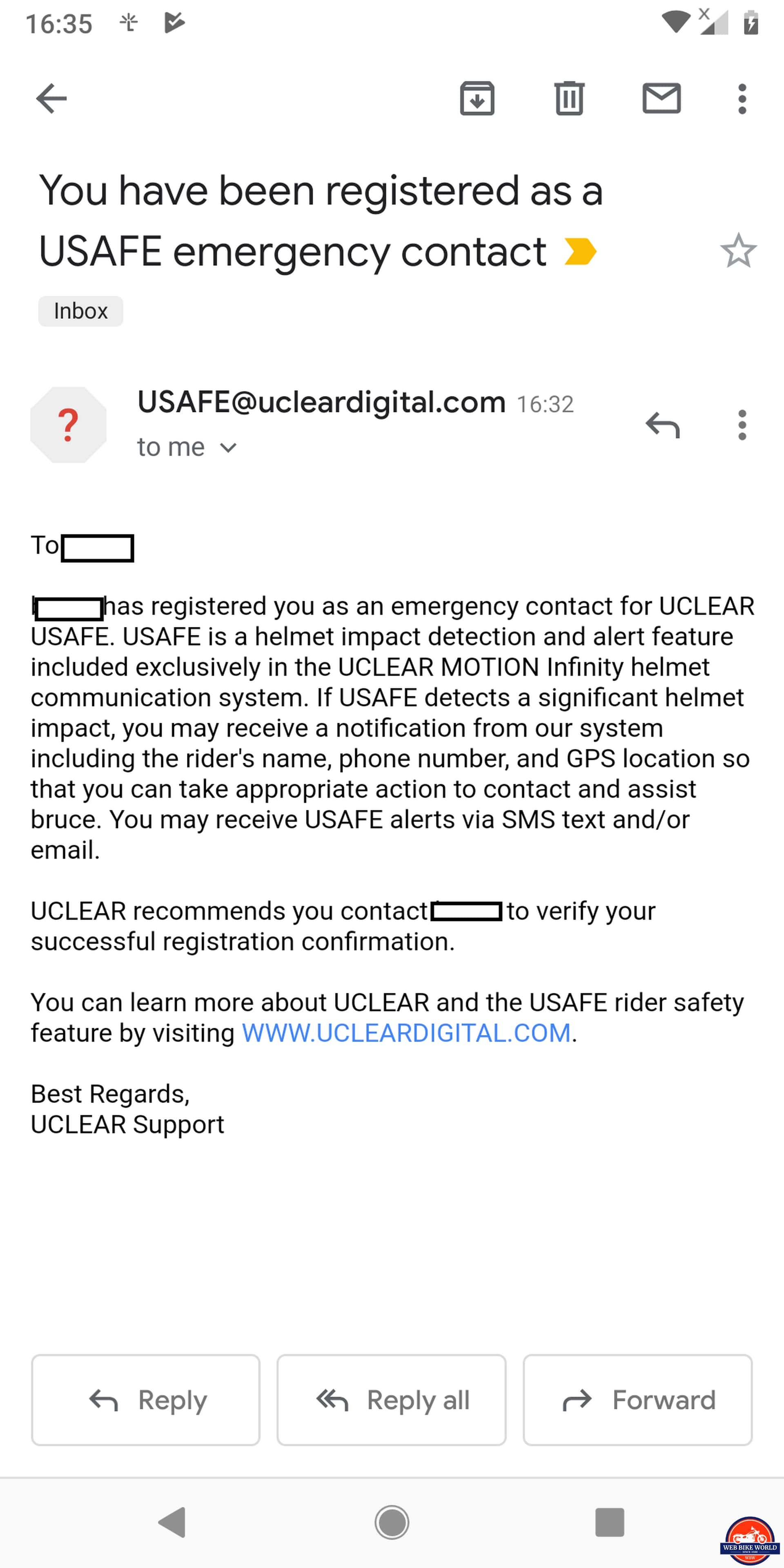 If a severe impact or crash occurs and the UClear Motion Infinity is paired/connected to a GPS (location feature) enabled mobile device and is paired with the CLEARLink app, USAFE responds after 30 seconds (user intervention period) to notify (listed) emergency contacts of your situation, identified position, and listing the closest medical facilities.